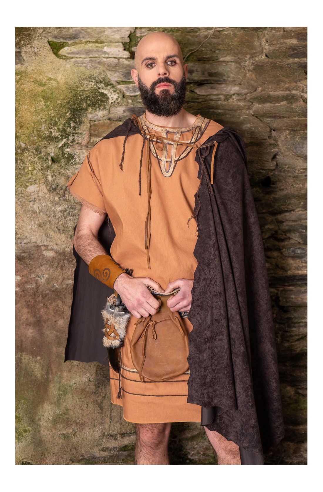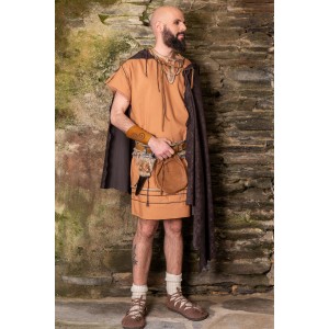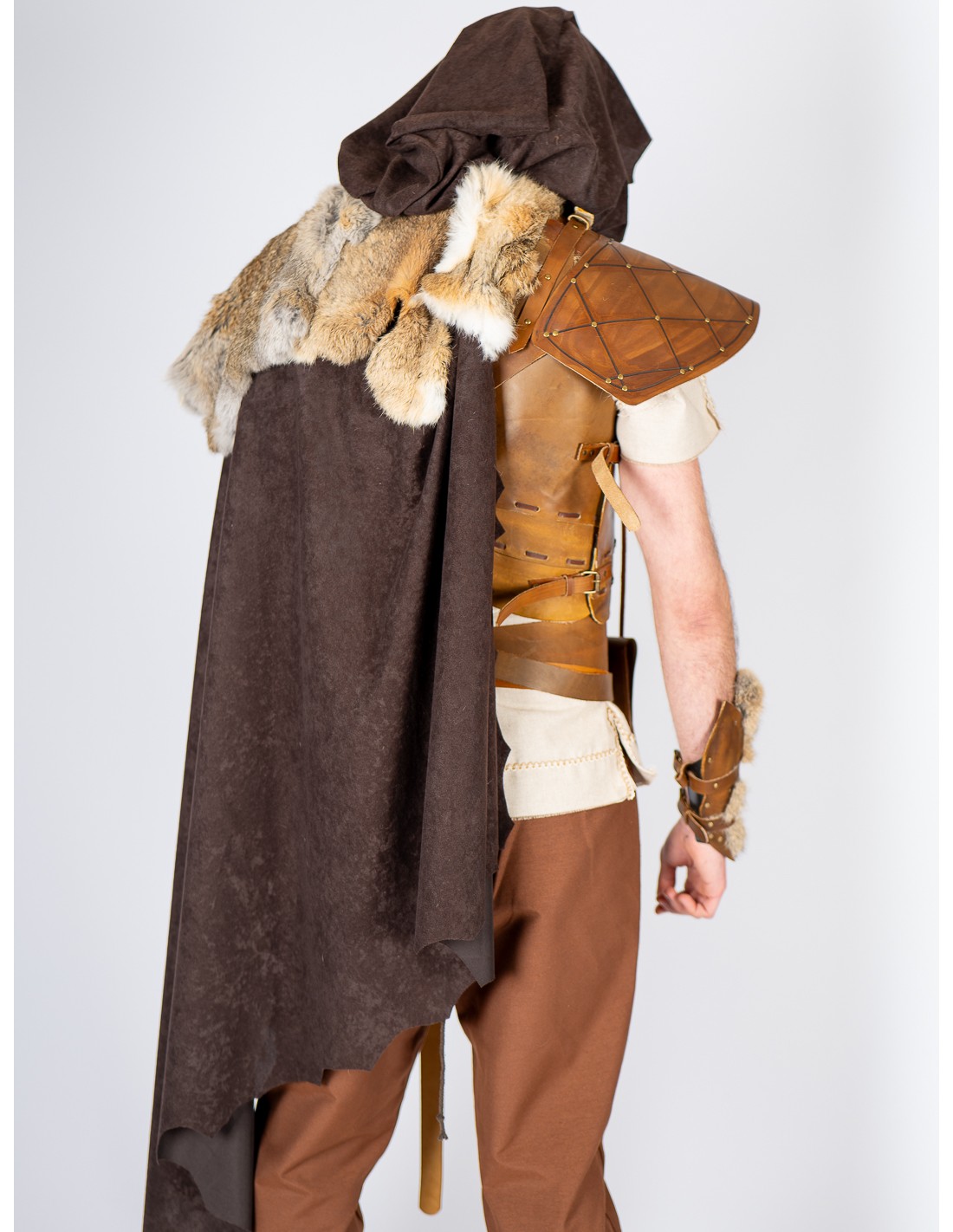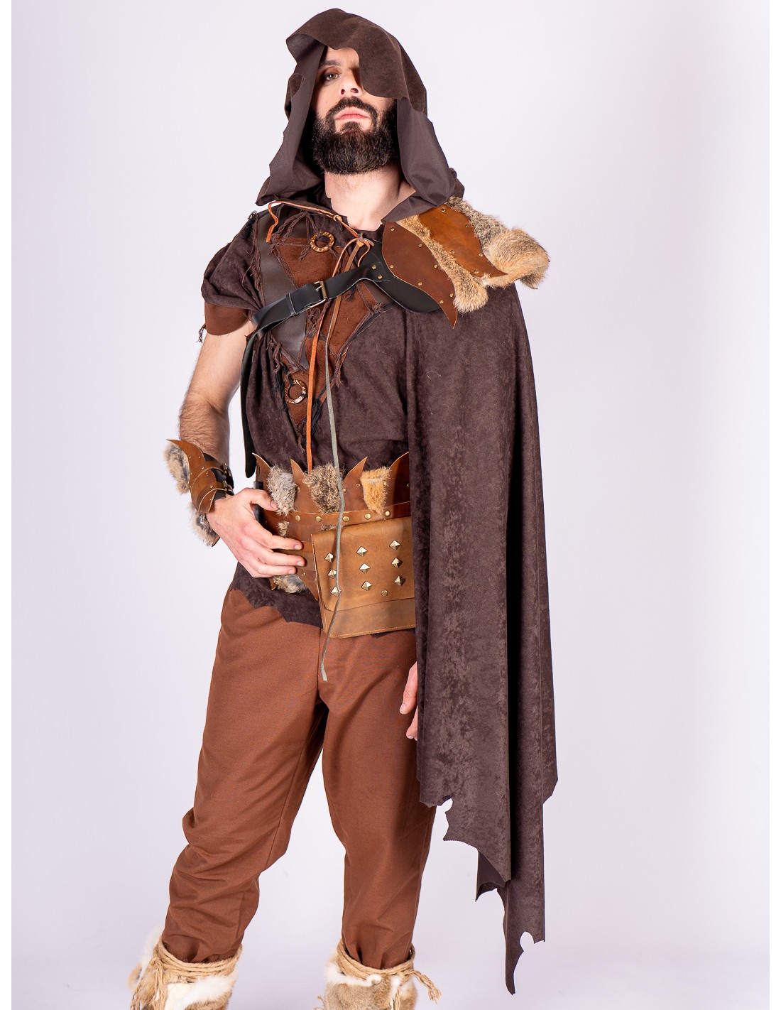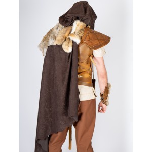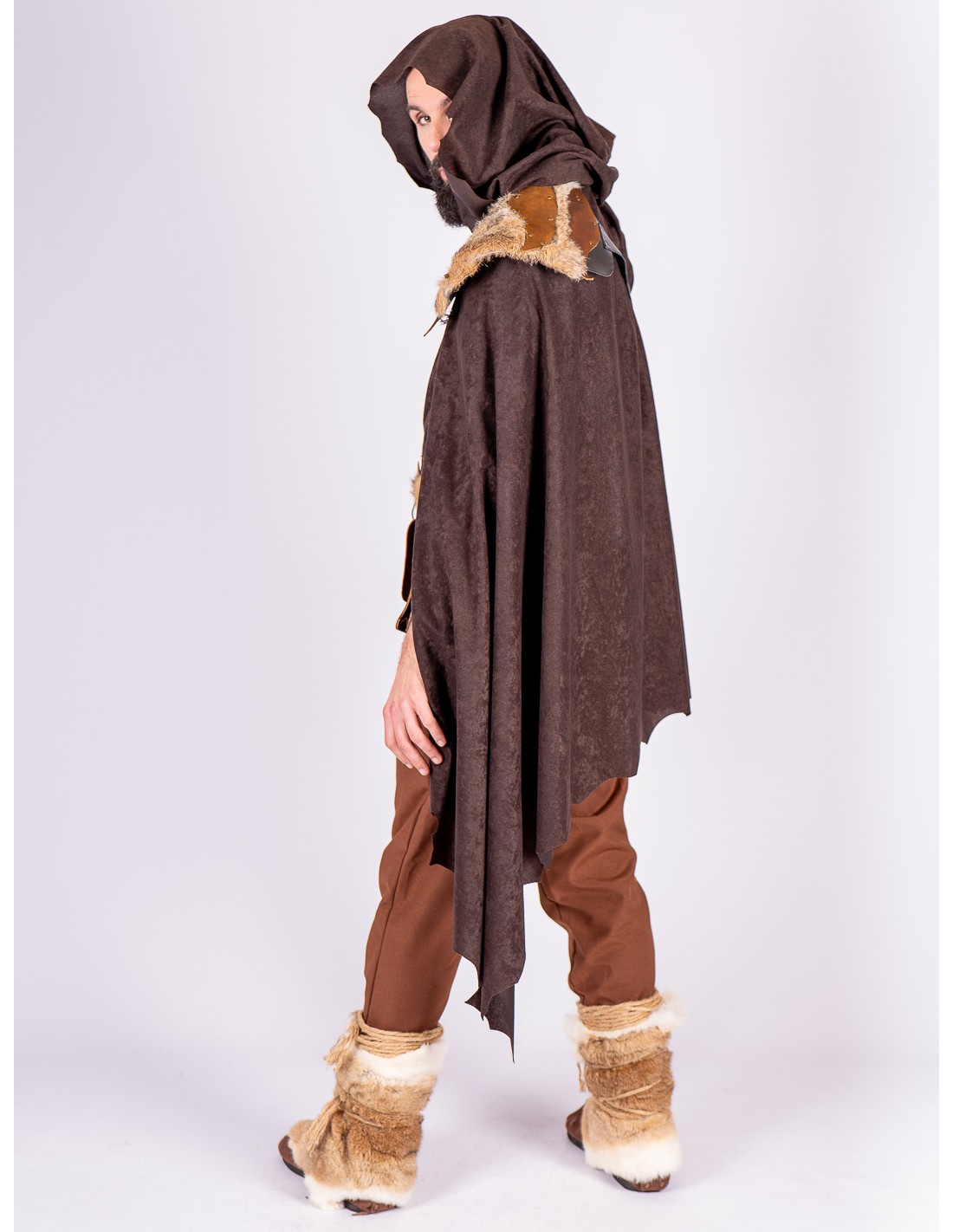 This brown hooded cloak is crafted for those seeking an outfit full of character and authenticity. Made from fabric with a flowing drape and an aged leather-like finish, its design echoes the garments worn by explorers, druids, and warriors of old. The large, enveloping hood adds a touch of mystery and practicality, making it perfect for historical reenactments, fairs, or LARP.