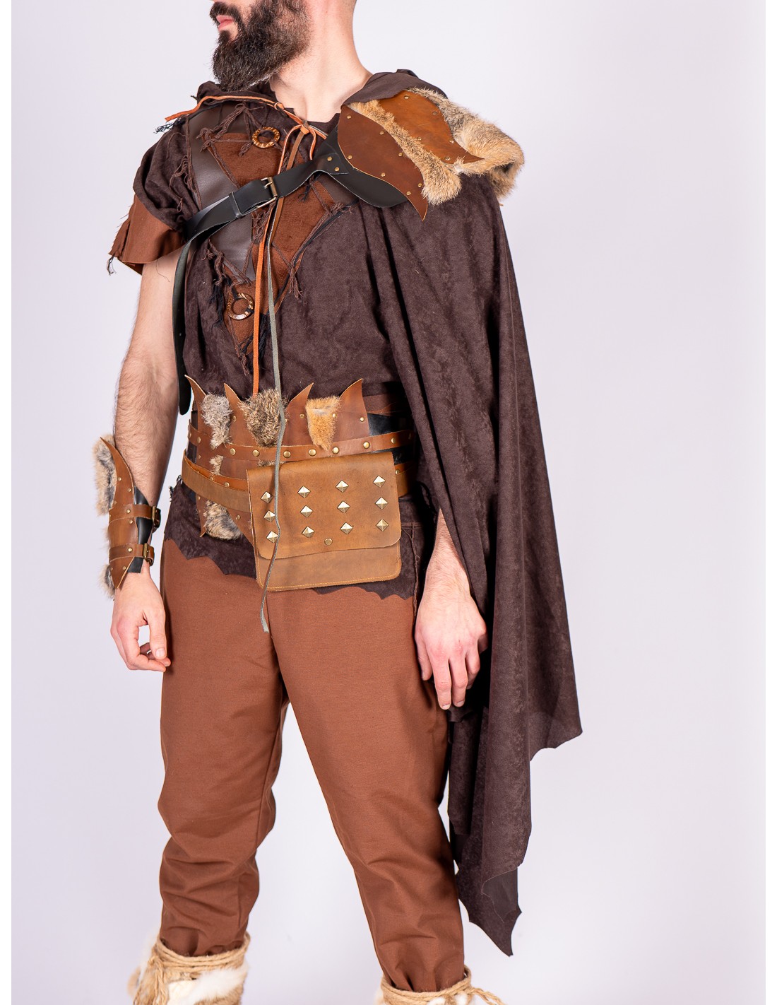 It fastens with leather straps, ensuring a comfortable and adjustable fit. The irregular hem and fur detail on the shoulders enhance its rustic appeal, pairing seamlessly with tunics and leather belts for a complete look.