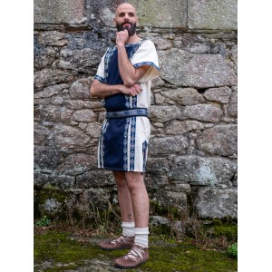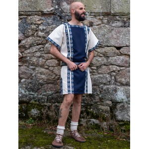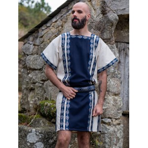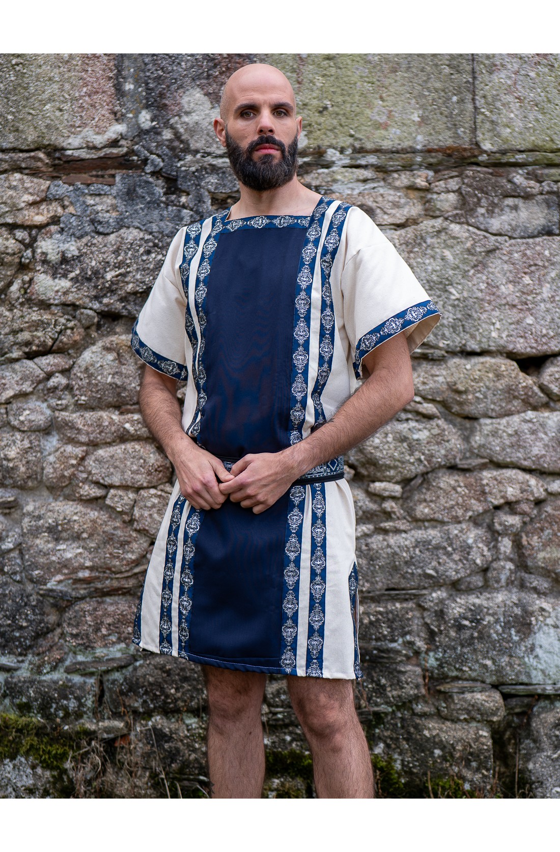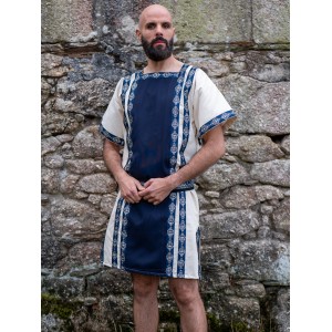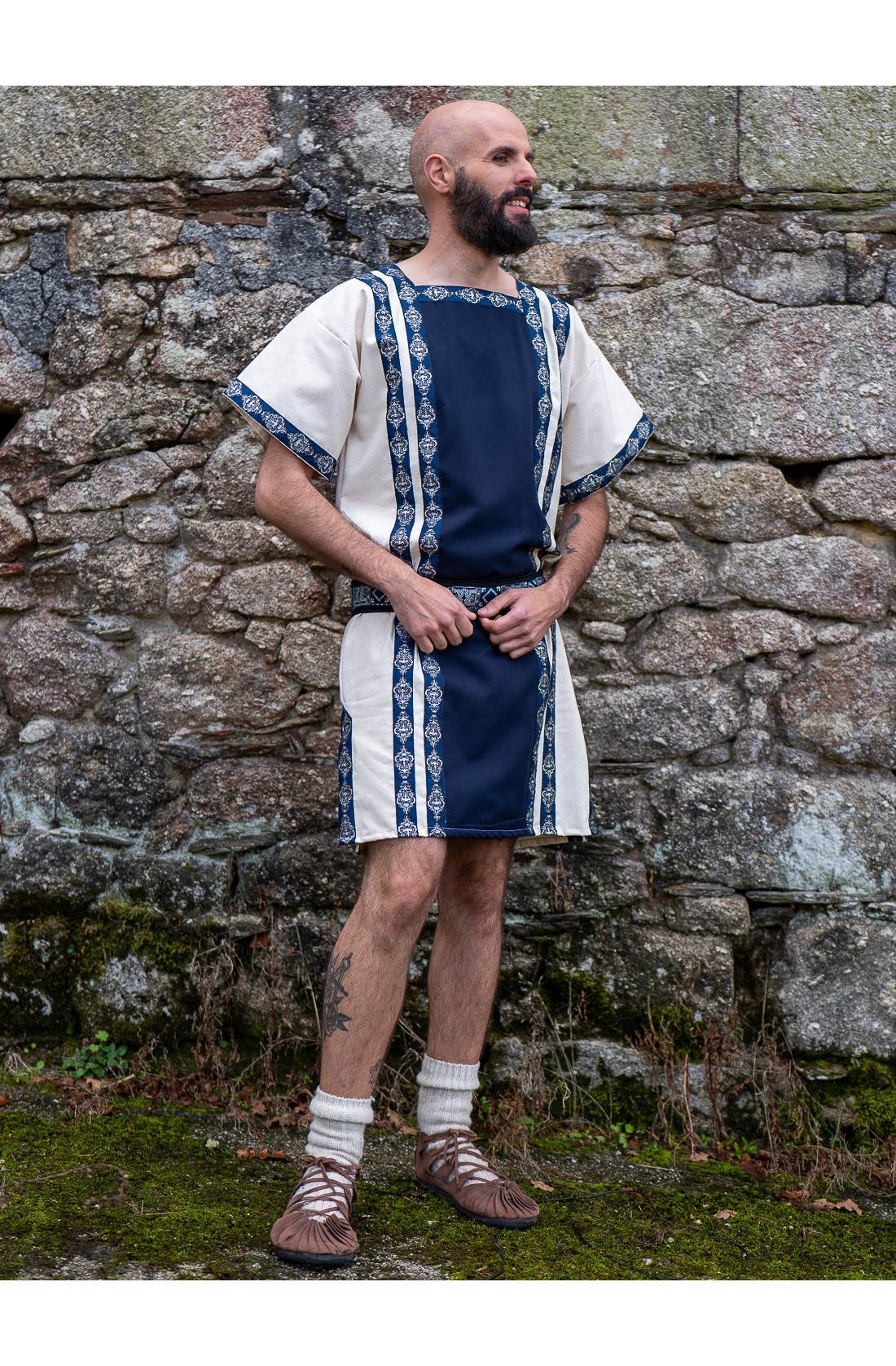 Roman tunic in a soft cotton blend, in ivory white and deep blue, finished with silver patterned trims inspired by ancient motifs. Decorative bands frame the front and sleeves, and the matching belt shapes the waist, giving the look of a Roman citizen ready for festival or market. Comfortable for long days at a historical reenactment event, it works well with sandals, a light cloak or leather accessories handmade in the Yutecrea workshops.
