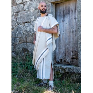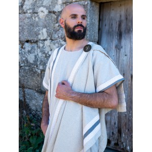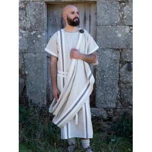 Roman garment in a cotton blend with a rustic weave, combined with grey bands and trim. The toga falls from the shoulder in a wide fold and stays in place with an old-gold lion brooch, a detail closely tied to the handmade work of the Yutecrea workshops. The matching double-wrap belt helps shape the figure while keeping the fit comfortable during fairs or any historical reenactment event. It is a set made for anyone who wants a Roman look that feels elegant and easy to wear.