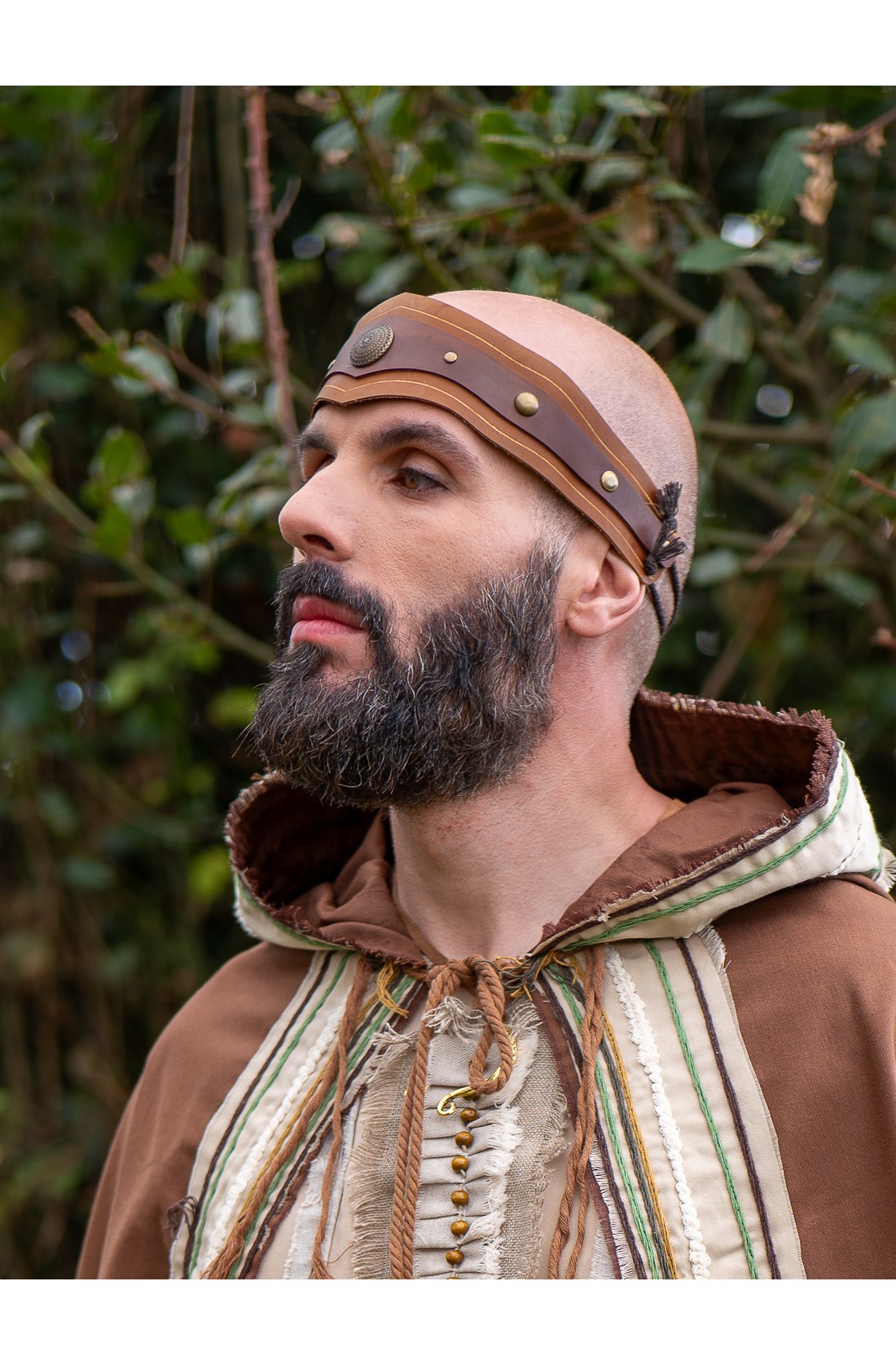 Leather headband crafted in the Yutecrea workshop, made for Celtic and Norse characters in medieval fairs and LARP. It’s made from flexible leather with a soft touch, decorated with metal rivets and a central piece that gives it a rough, handcrafted look. It ties at the back with a cord, so it adjusts easily and stays in place without feeling uncomfortable during long reenactment days.