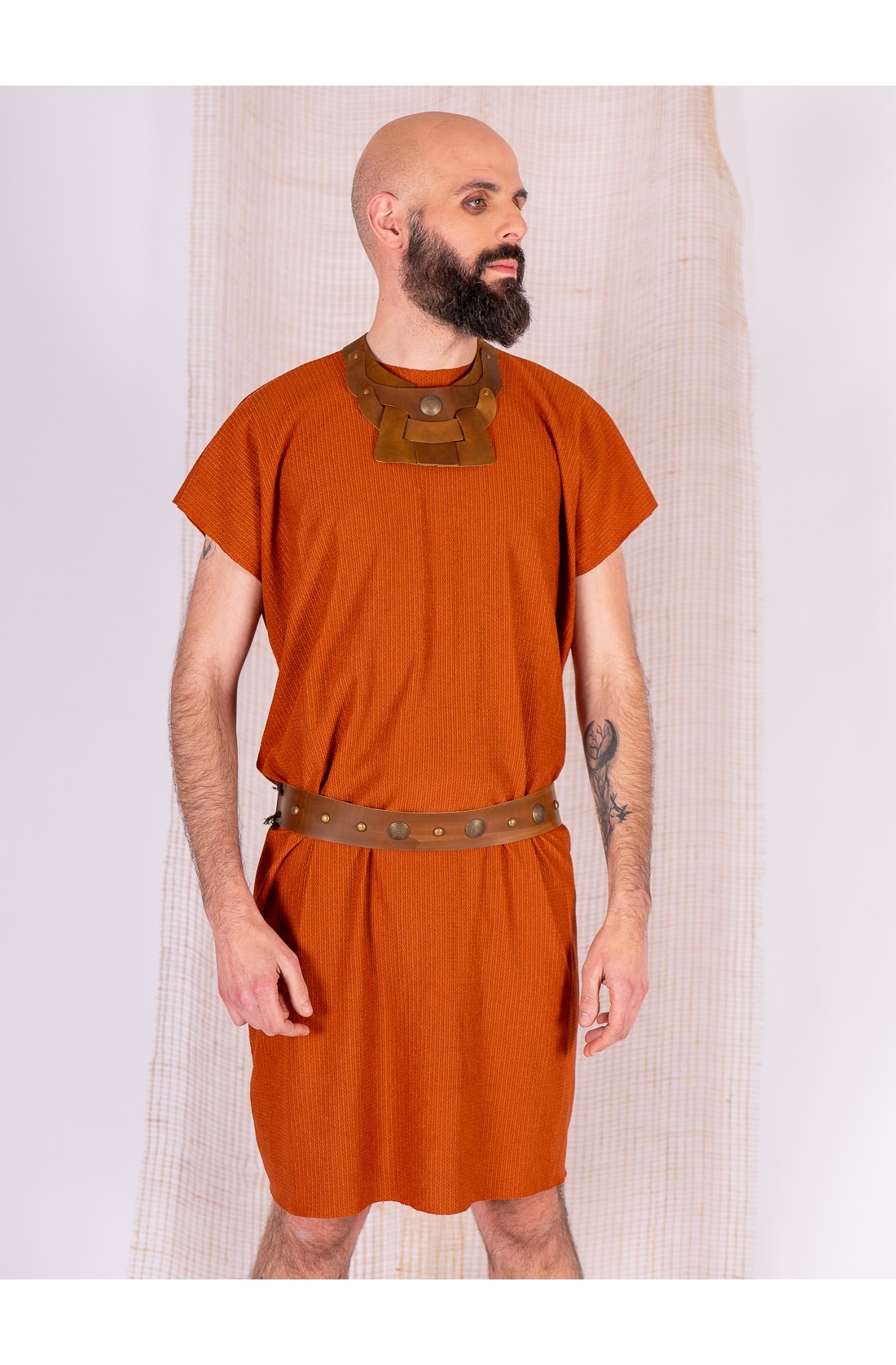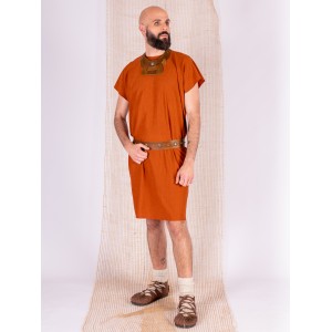 Basic and fresh rustic fabric set in caldera color, designed for long days at fairs or reenactment. The tunic, in that warm tone between earth and clay, is made from a lightweight fabric with a marked texture and a pleasant feel. It falls straight without stiffness and is adjusted at the waist with a riveted leather belt that adds structure and character.