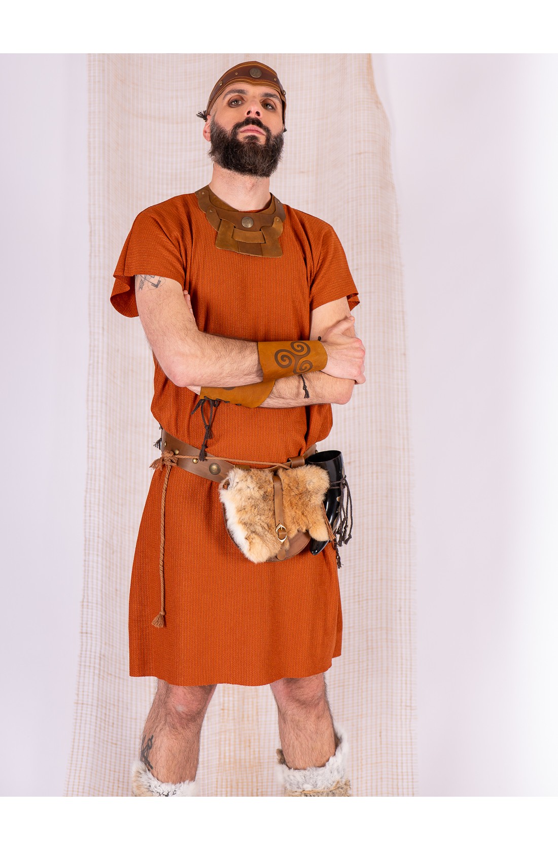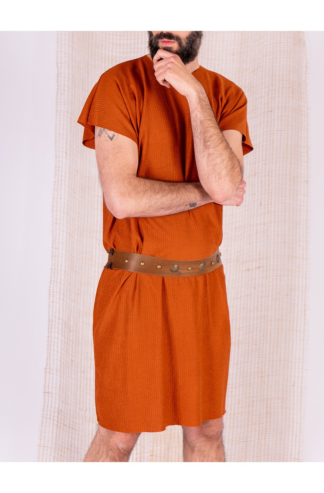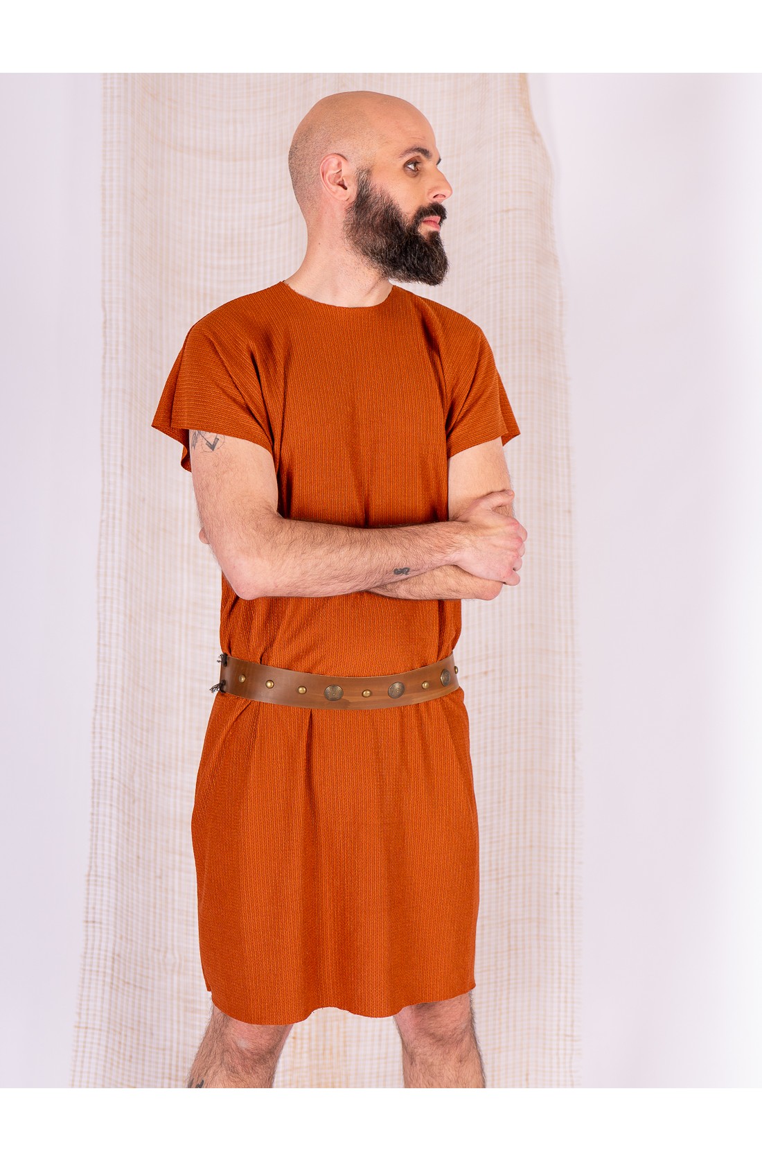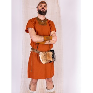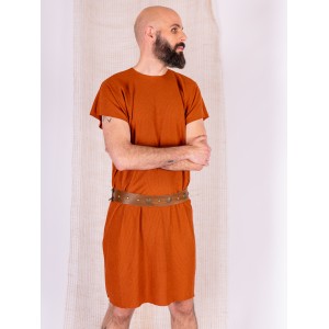 Simple tunic set in caldera with a leather belt, created for Celtic or Viking settings. The garment is made from rustic fabric with a visible texture, light body and a straight drape. It moves naturally when walking and keeps a clean line across the torso.