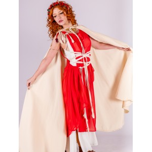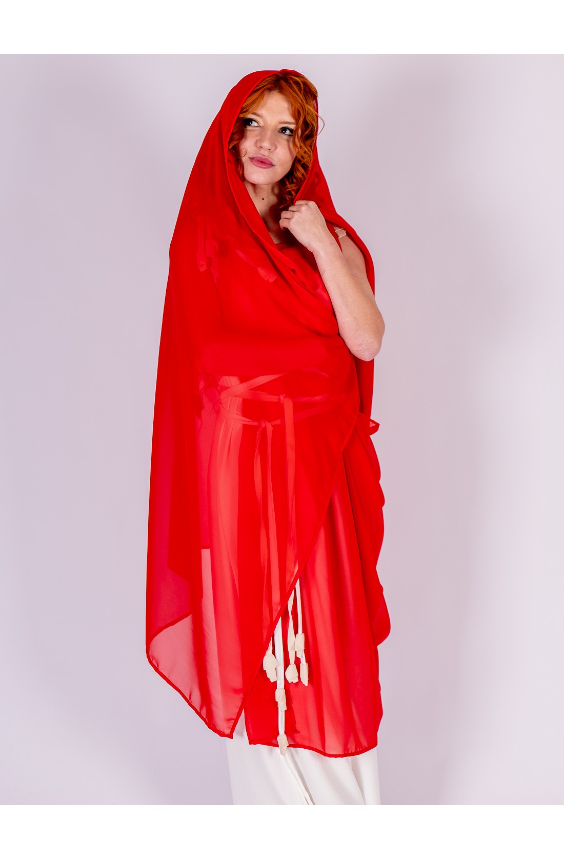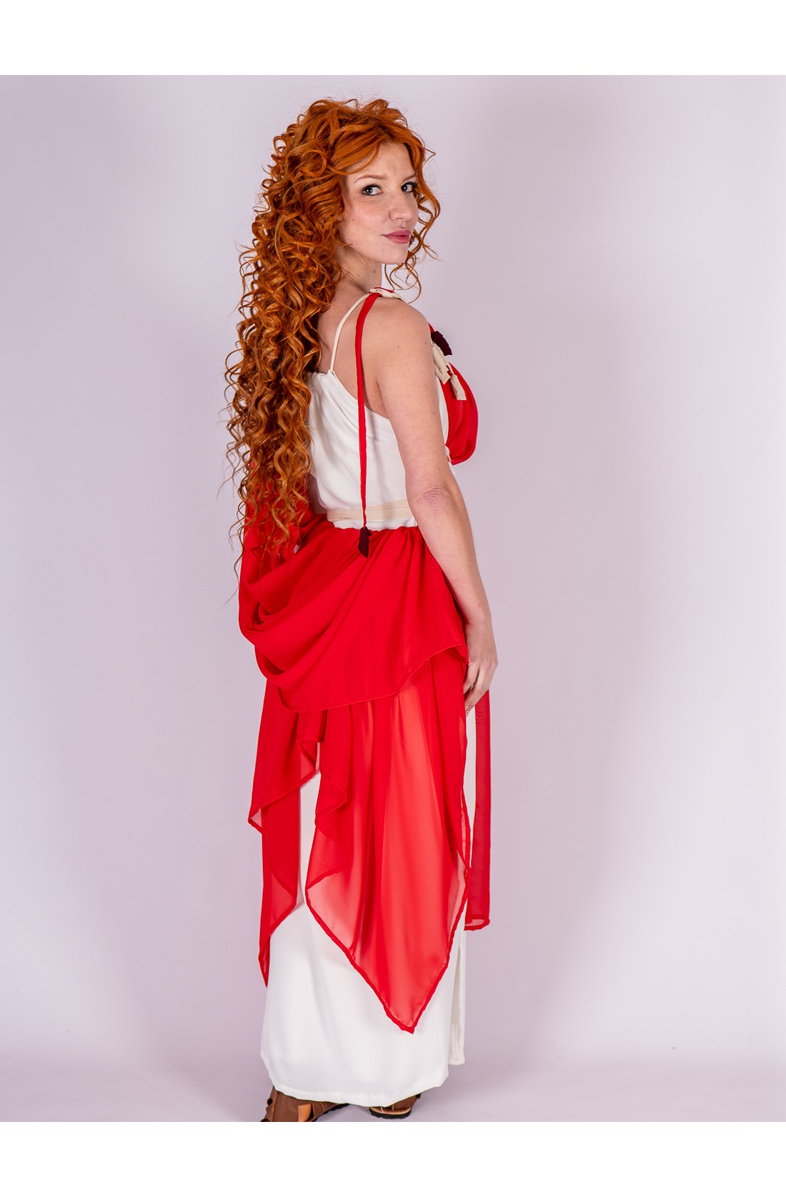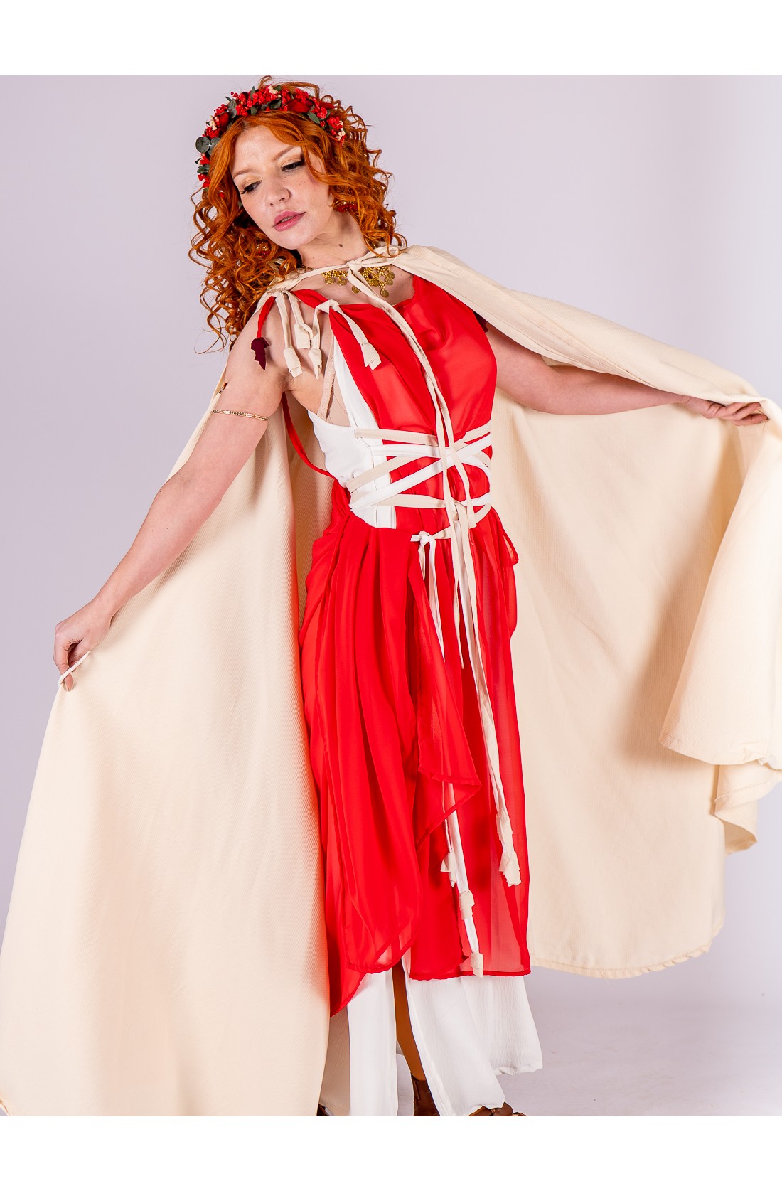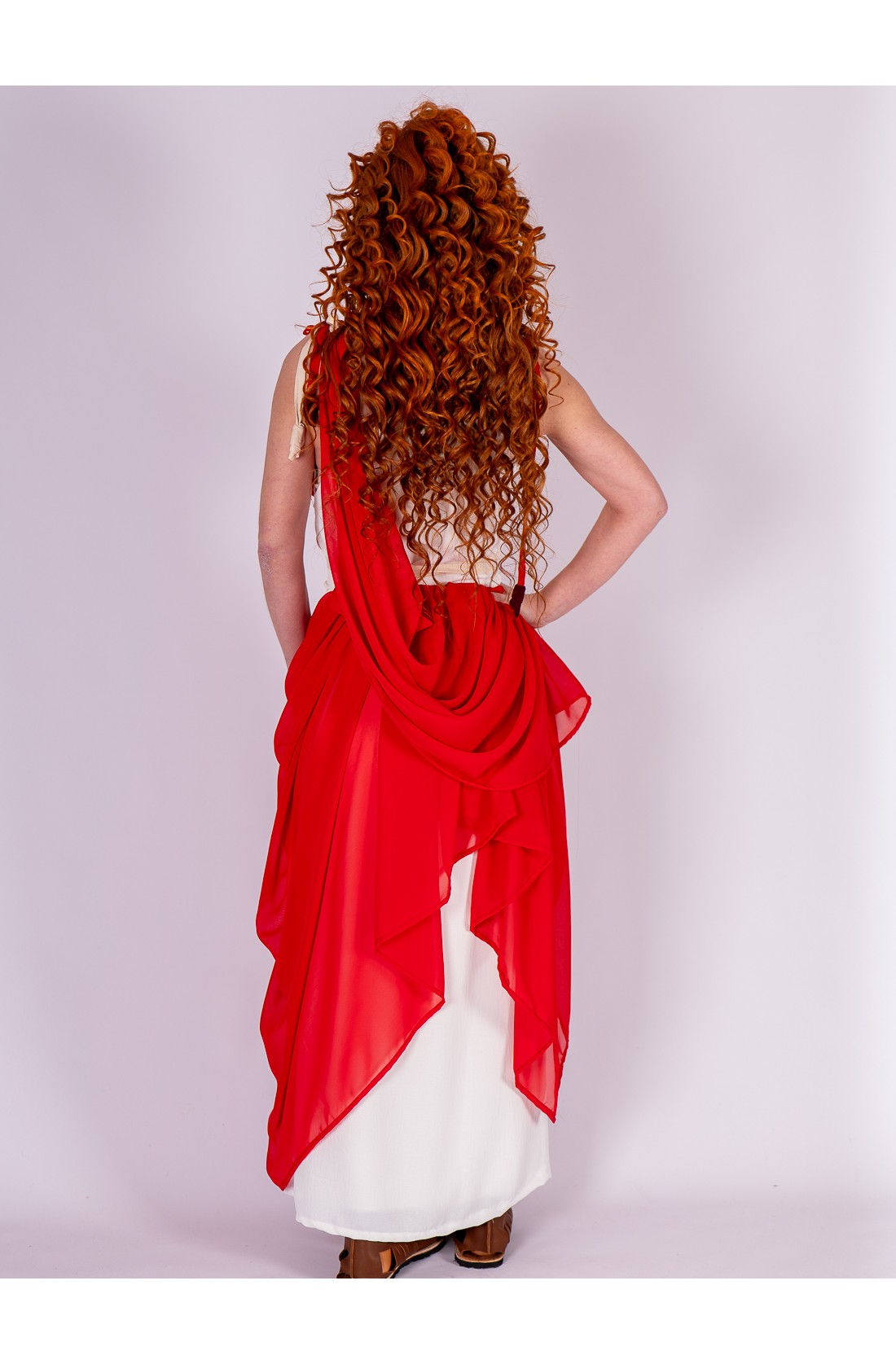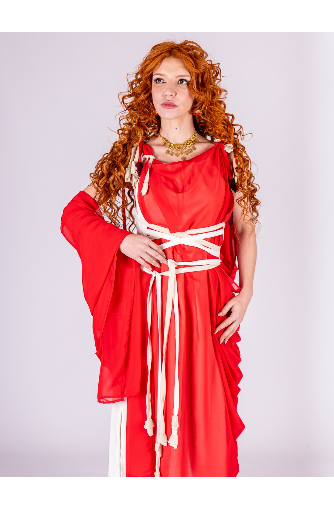 Roman-inspired ensemble composed of two pieces. The base is a white dress with a fluid drape, featuring integrated ties that cross at the waist to gently shape and define the silhouette. Layered over it is a lightweight red chiffon piece that adds contrast and movement.