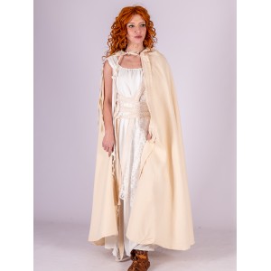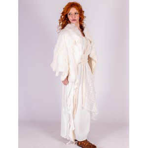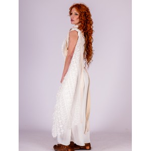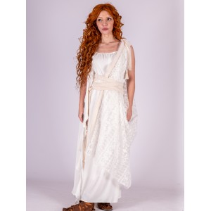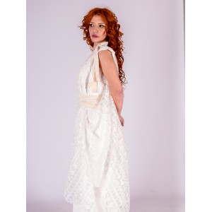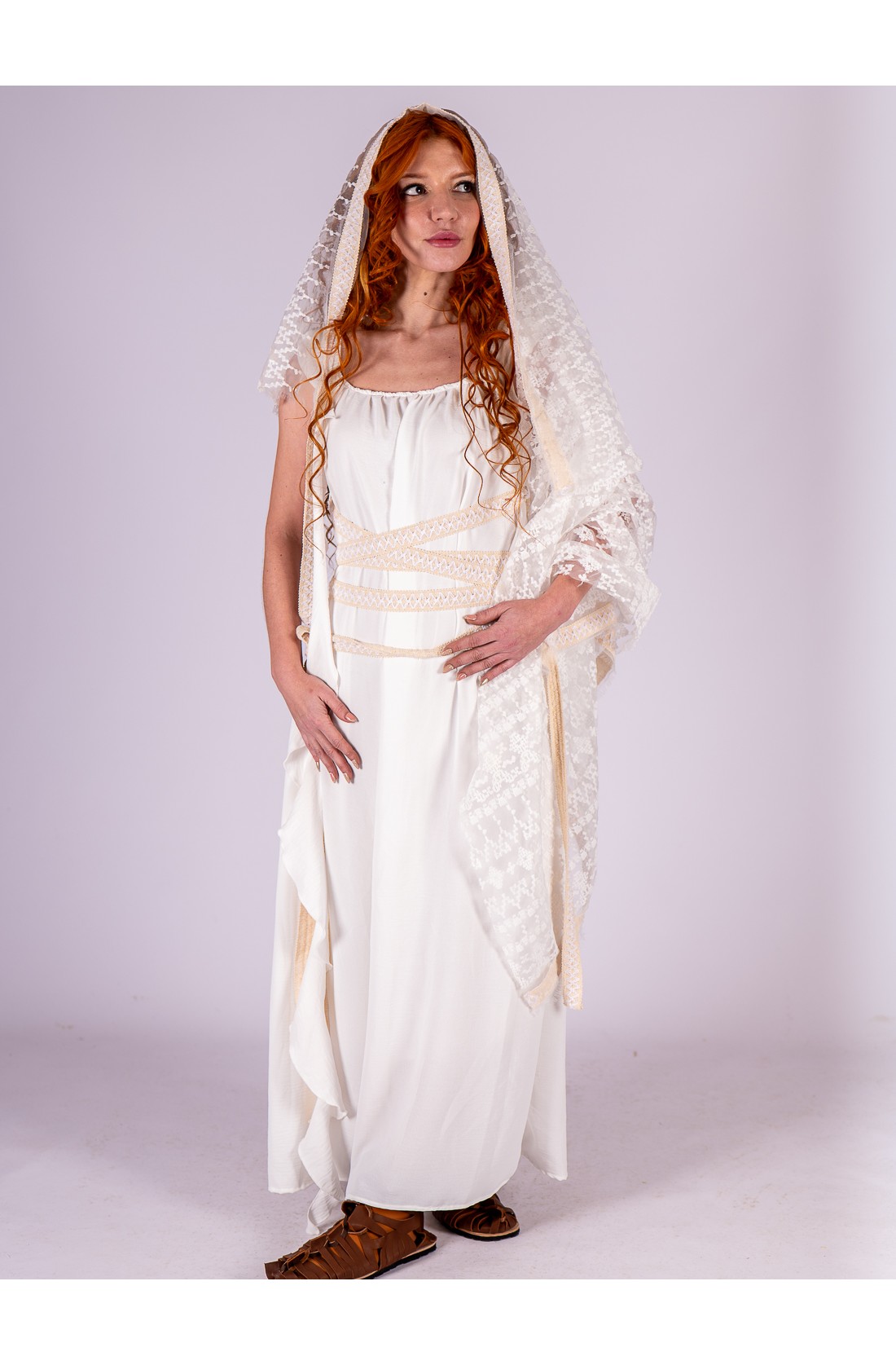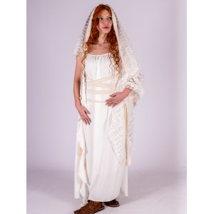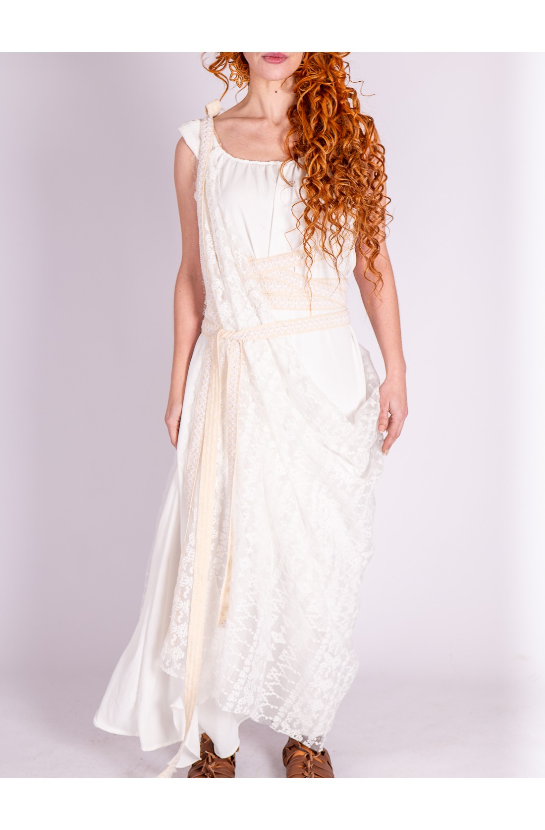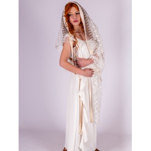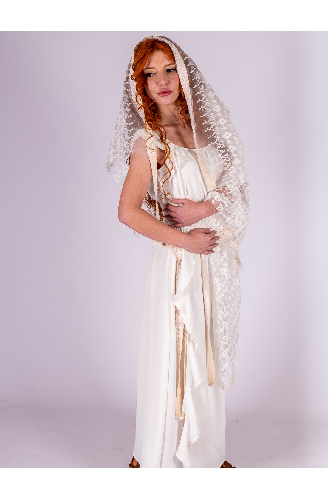 It is accompanied by an off-white lace mantle featuring a refined geometric pattern inspired by classical motifs, finished in ecru. It can be worn draped over one shoulder or covering the head as a veil, creating a ceremonial and ethereal presence. The layering of textures adds depth and movement, evoking the elegance of Roman mosaics and the serene refinement of antiquity.