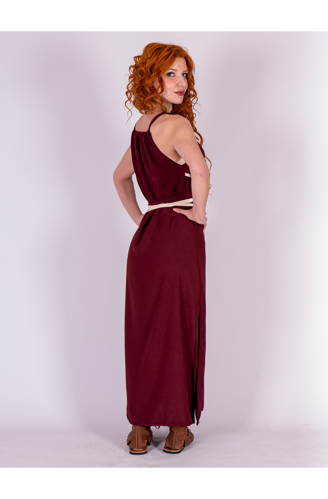 Long Roman-inspired dress in a deep burgundy tone, crafted from a lightweight fabric with a fluid drape that moves gracefully with every step.