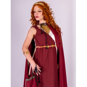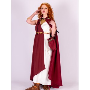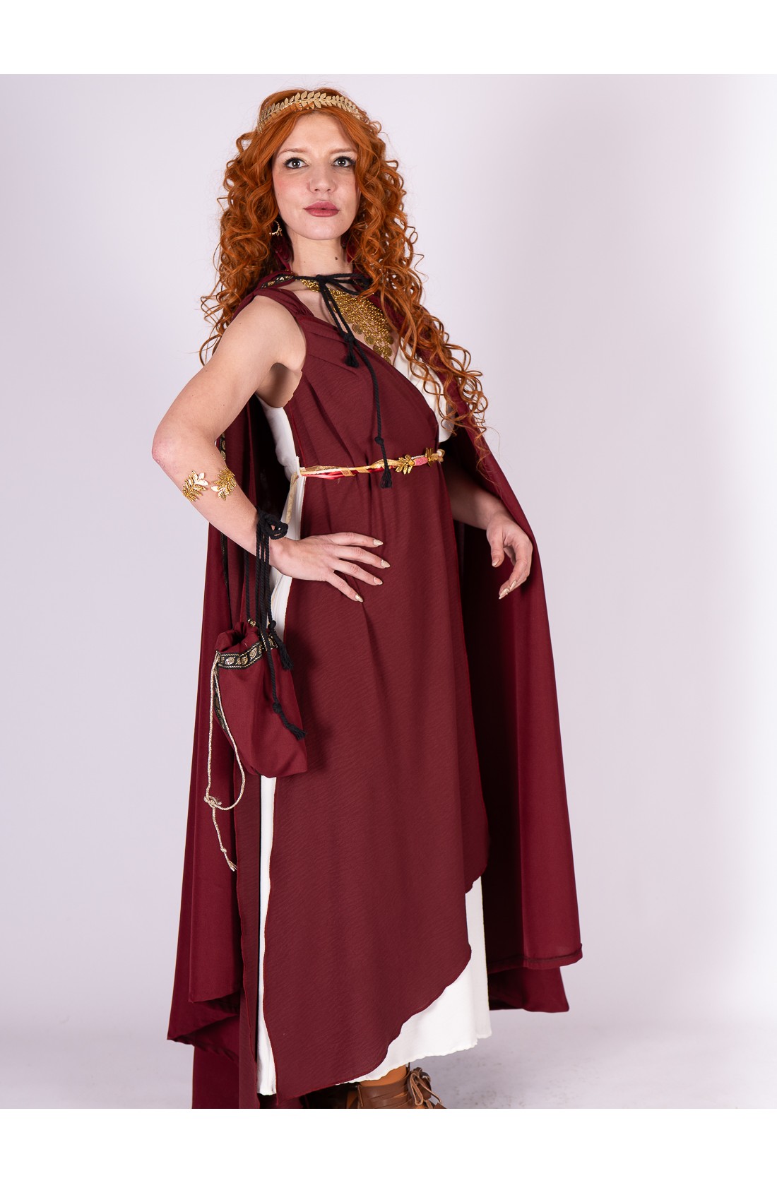 The wide hood is trimmed with a decorative gold leaf ribbon, a detail that frames the face with light and adds a ceremonial touch without feeling excessive. The contrast between burgundy and gold enhances the classical aesthetic and elevates any Roman dress in ivory, white, or cream tones.
