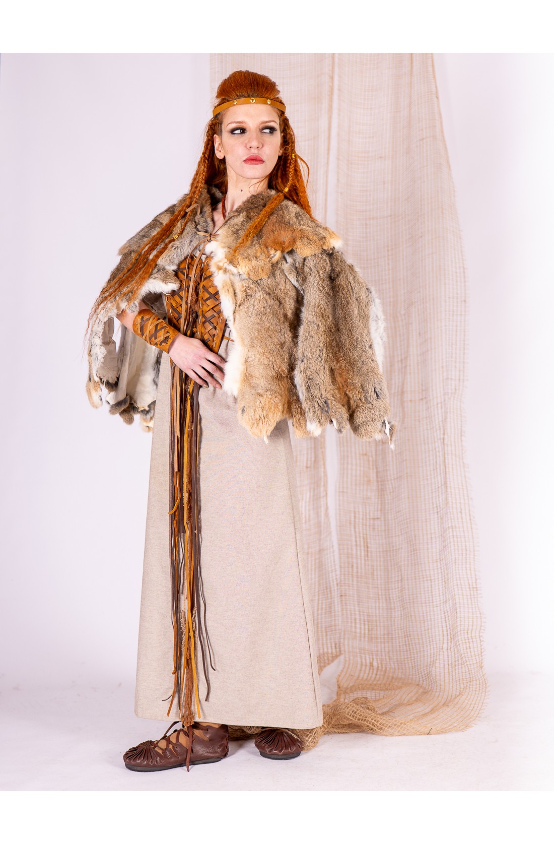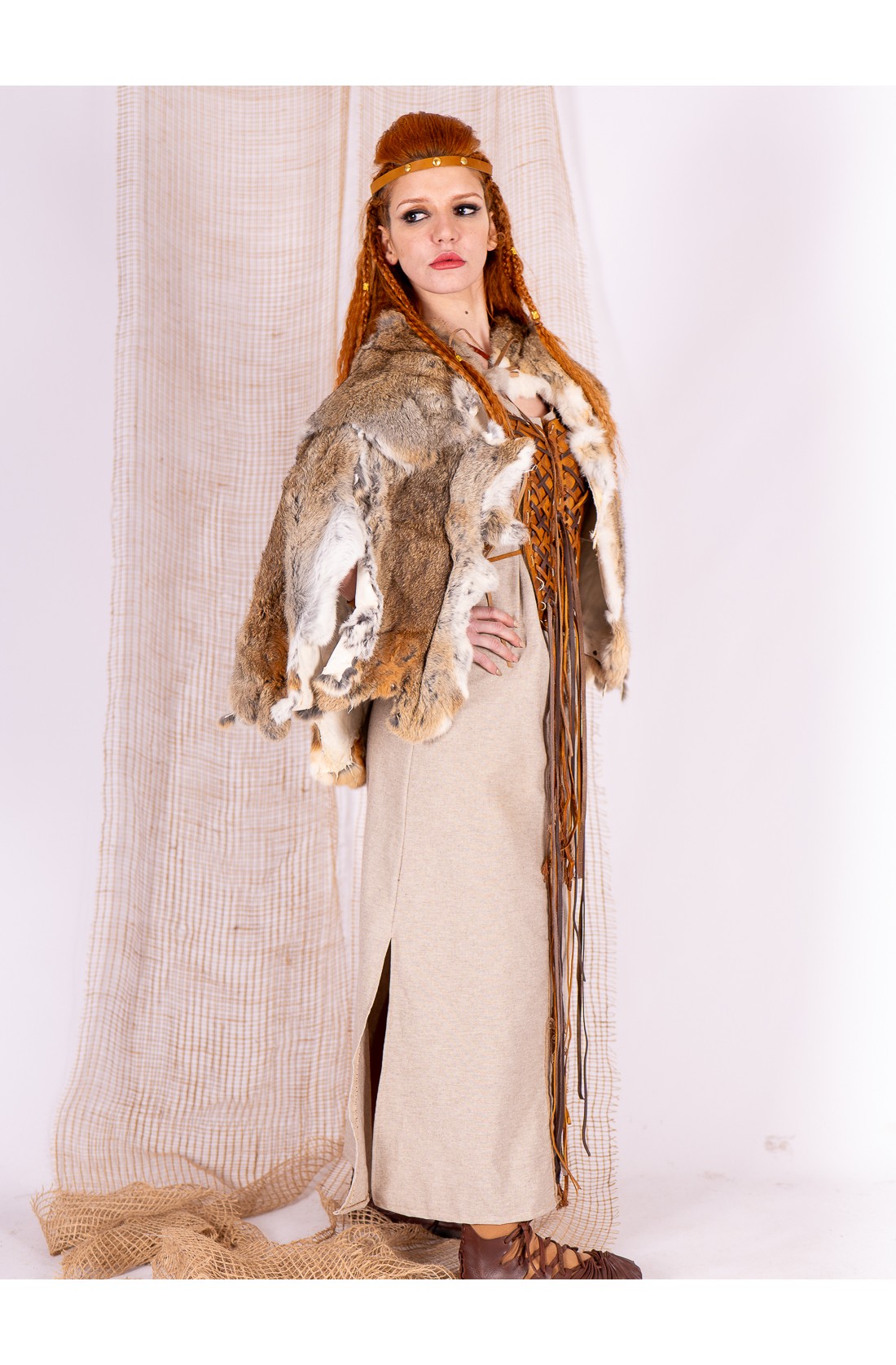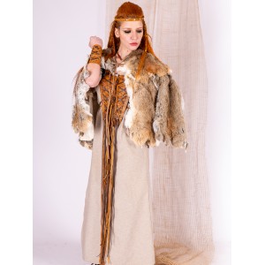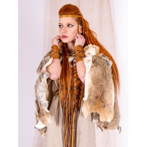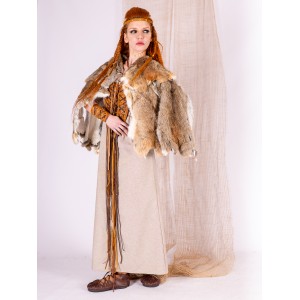 Winter cape made of natural rabbit fur, designed for Celtic and Viking women looking for a warm garment with presence. The natural fur creates a surface rich in nuances, with earthy and light tones.
