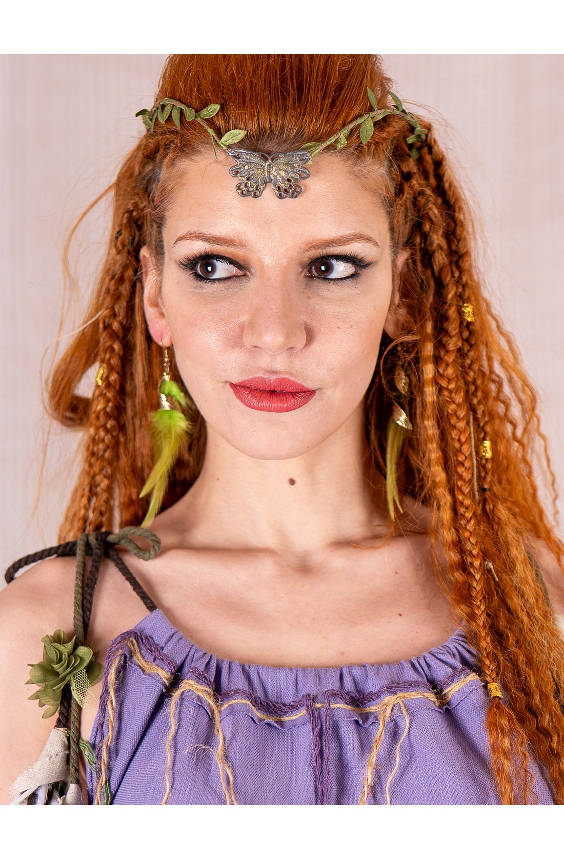 Headpiece designed to be worn across the forehead, featuring a central butterfly element with an aged finish that blends silver and gold tones. The metal has a soft, muted look, without excessive shine, with a slightly worn appearance that fits naturally into historical settings.