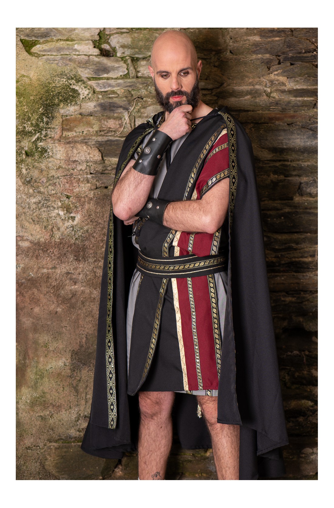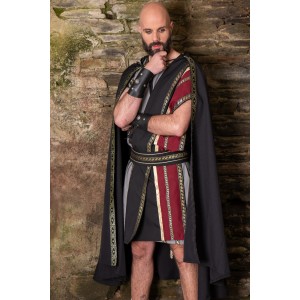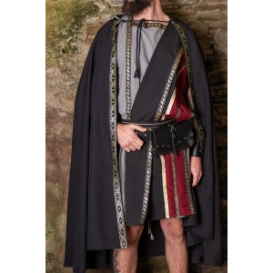Roman cloak in black, with a hood and decorative trimming along the edge. It has a wide drape and a serene bearing, with that sober elegance that suits Roman aesthetics so well. The hood reinforces its ceremonial feel and turns it into an outer layer with presence, designed to accompany tunics and historical reenactment outfits. Very fitting for Arde Lucus, Roman fairs, LARP, or classical-themed events. A garment with clean lines, character, and a silhouette that dresses beautifully.