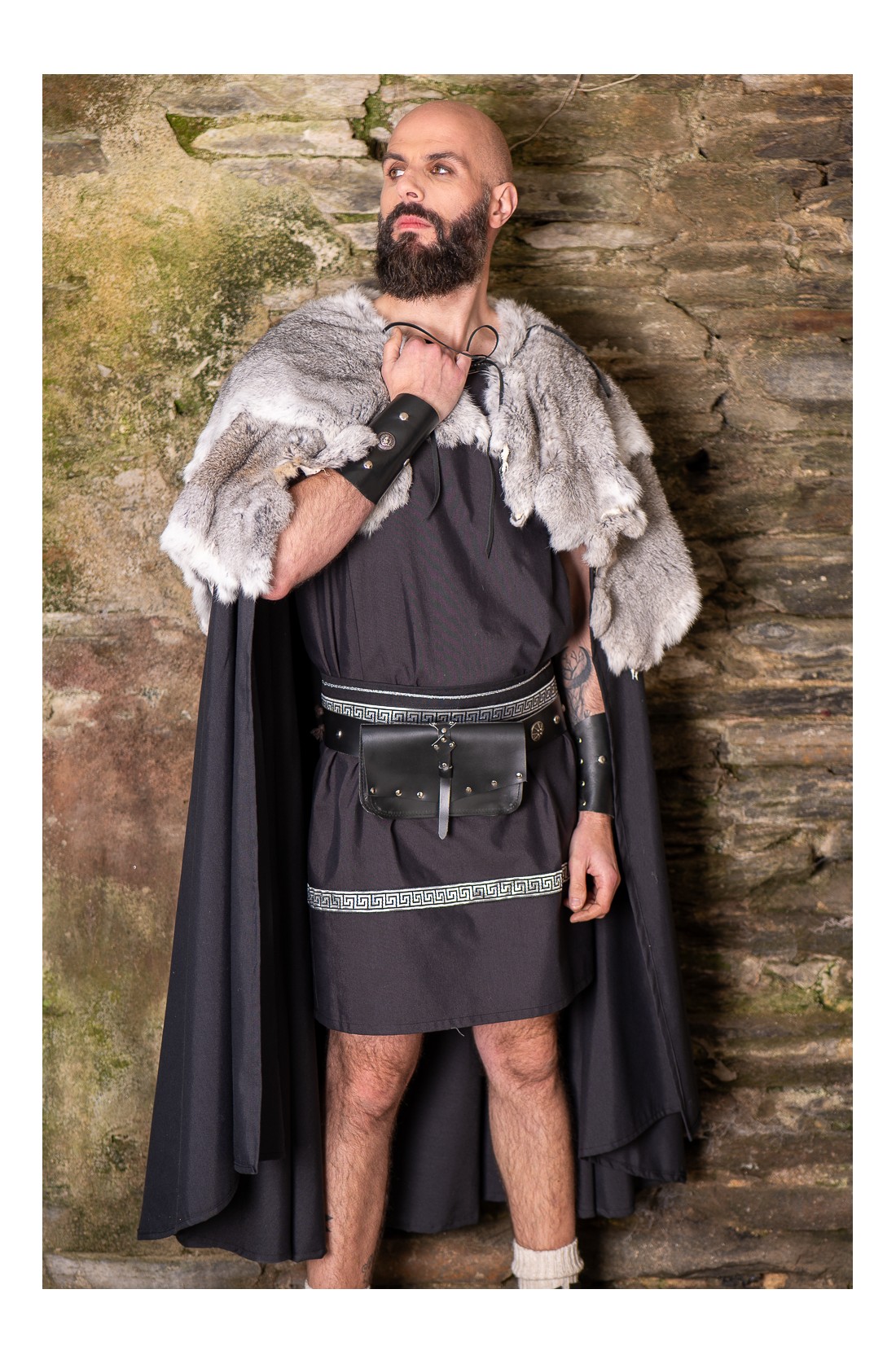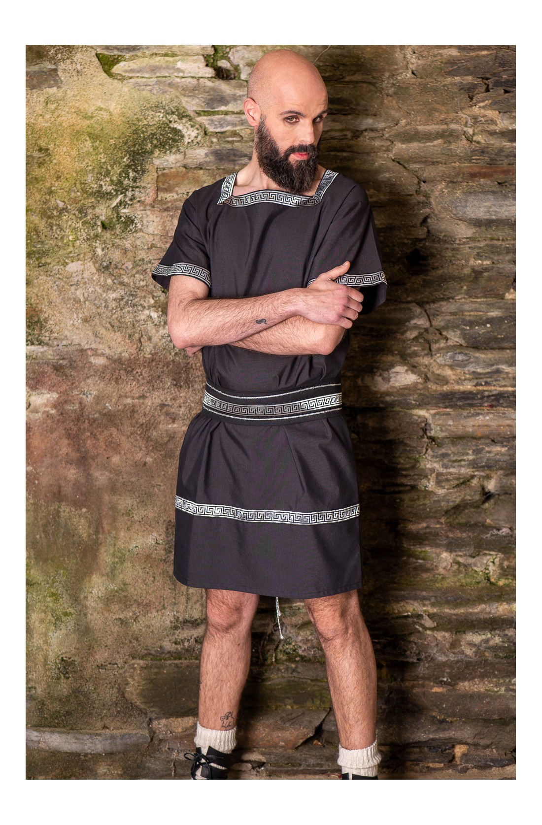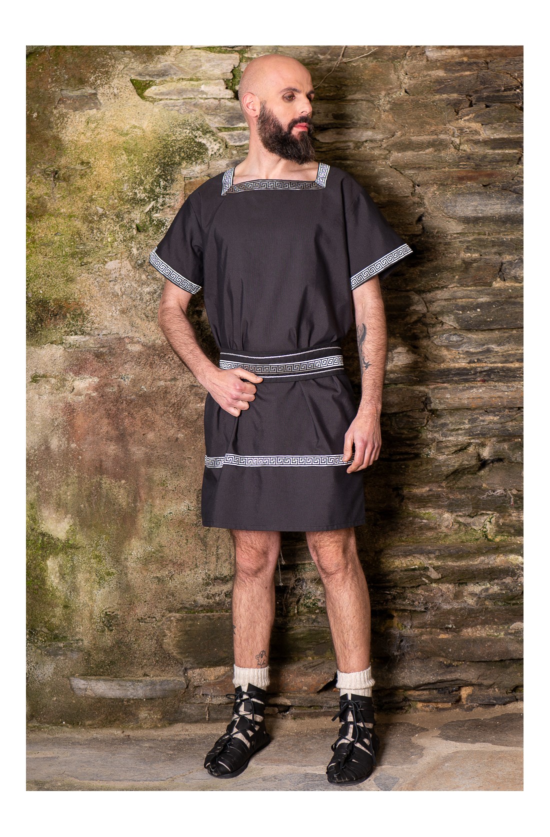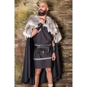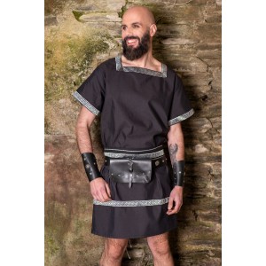 Roman set composed of a tunic and belt, with silver trims on the neckline, sleeves, and hem. Black and silver create a sober and elegant combination, with that classical air that fits Roman aesthetics beautifully. Made from a cotton blend, it has a natural drape and a clean bearing. A costume base for your Roman character, designed for Roman fairs, Arde Lucus, historical reenactment, or LARP.