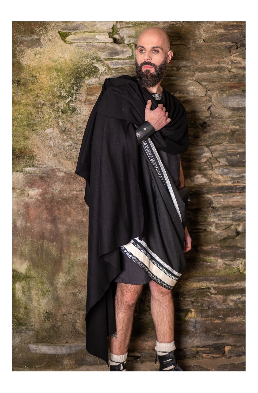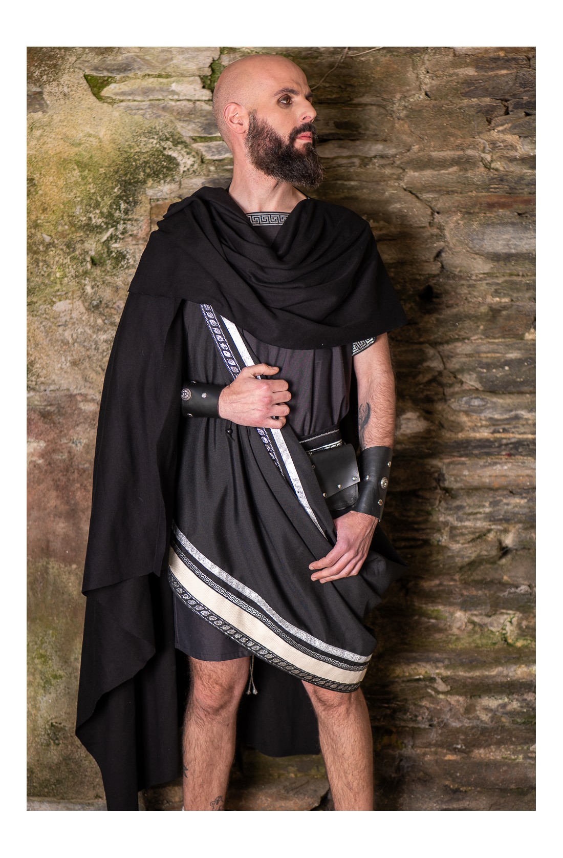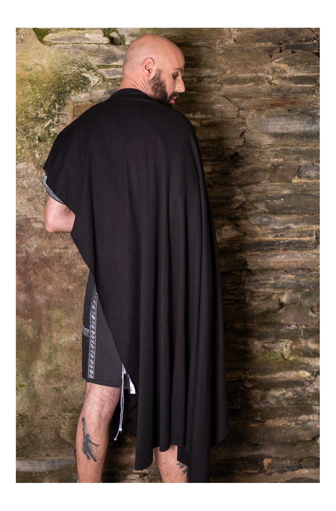 Roman cape in black knit, with a generous drape and an asymmetrical cut, designed at Yutecrea as a complement to accompany the outfit with a more realistic feel. It is a simple yet very stylish piece, allowing you to play with different ways of wearing it, as well as with brooches and fibulae, adding movement and depth to the whole look. It gives a little warmth, although its role leans more toward ornament and presence than that of a true winter garment. This item corresponds to the cape only.