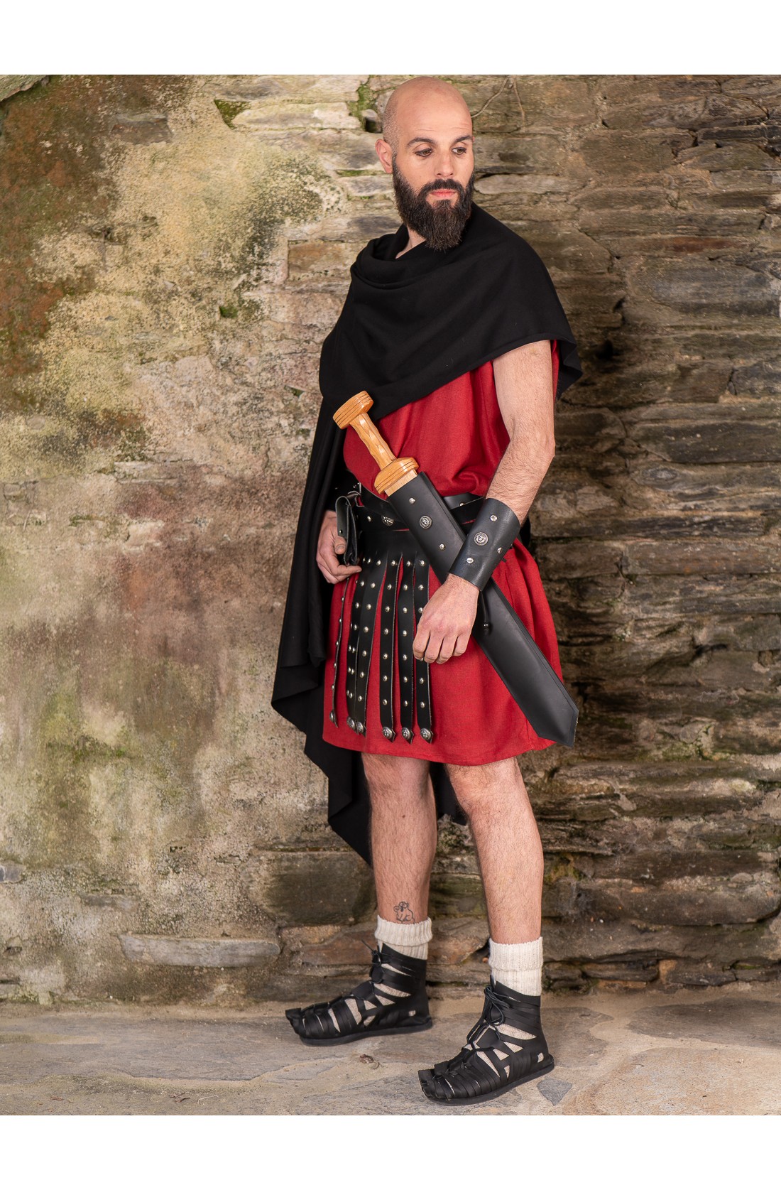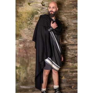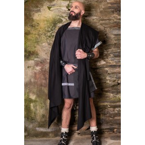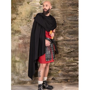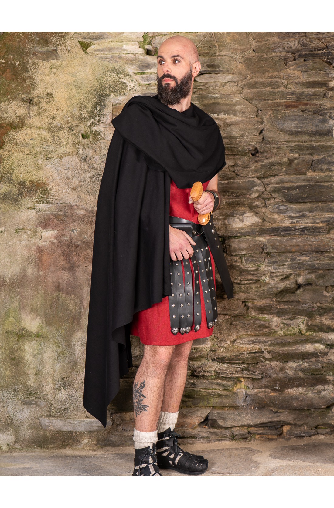 Roman cape in black knit, with a generous drape and an asymmetrical cut, designed at Yutecrea as a complement to accompany the outfit with a more realistic feel. It is a simple yet very stylish piece, allowing you to play with different ways of wearing it, as well as with brooches and fibulae, adding movement and depth to the whole look. It gives a little warmth, although its role leans more toward ornament and presence than that of a true winter garment. This item corresponds to the cape only.