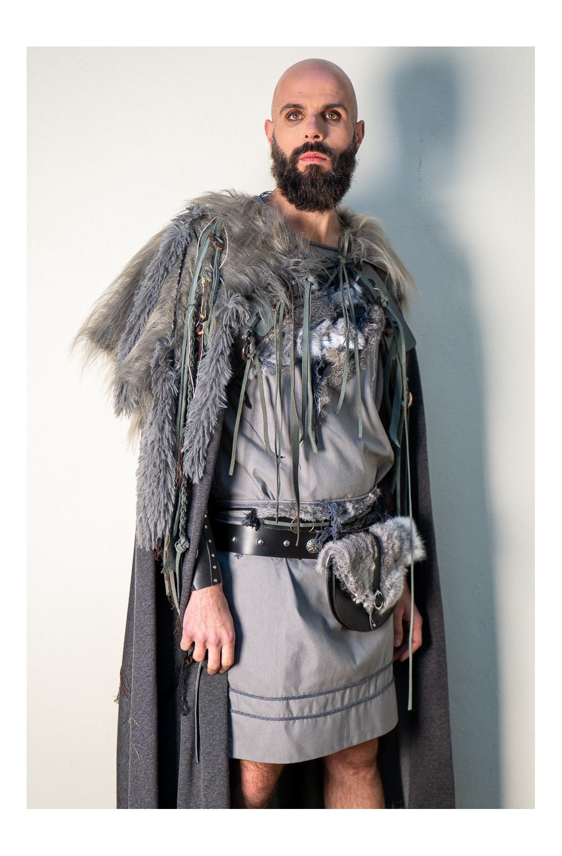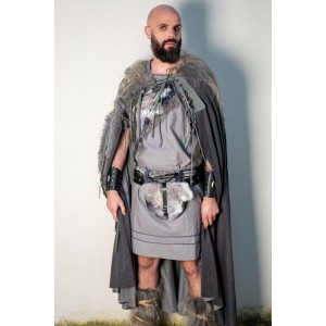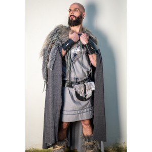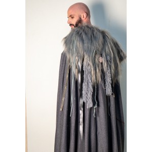 Dark grey cloak, finished at the shoulders with long vegan fur and a richly worked composition of leather strips, rustic braids, and wooden beads. It fastens with leather ties, and each cloak is handcrafted in our workshops, so slight variations in the details may appear, something natural in a handmade piece. Part of our grey collection, it moves within the same world as Yutecrea’s wolf collection, for LARP, historical reenactment, or cool summer nights.