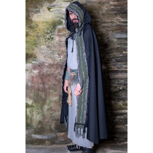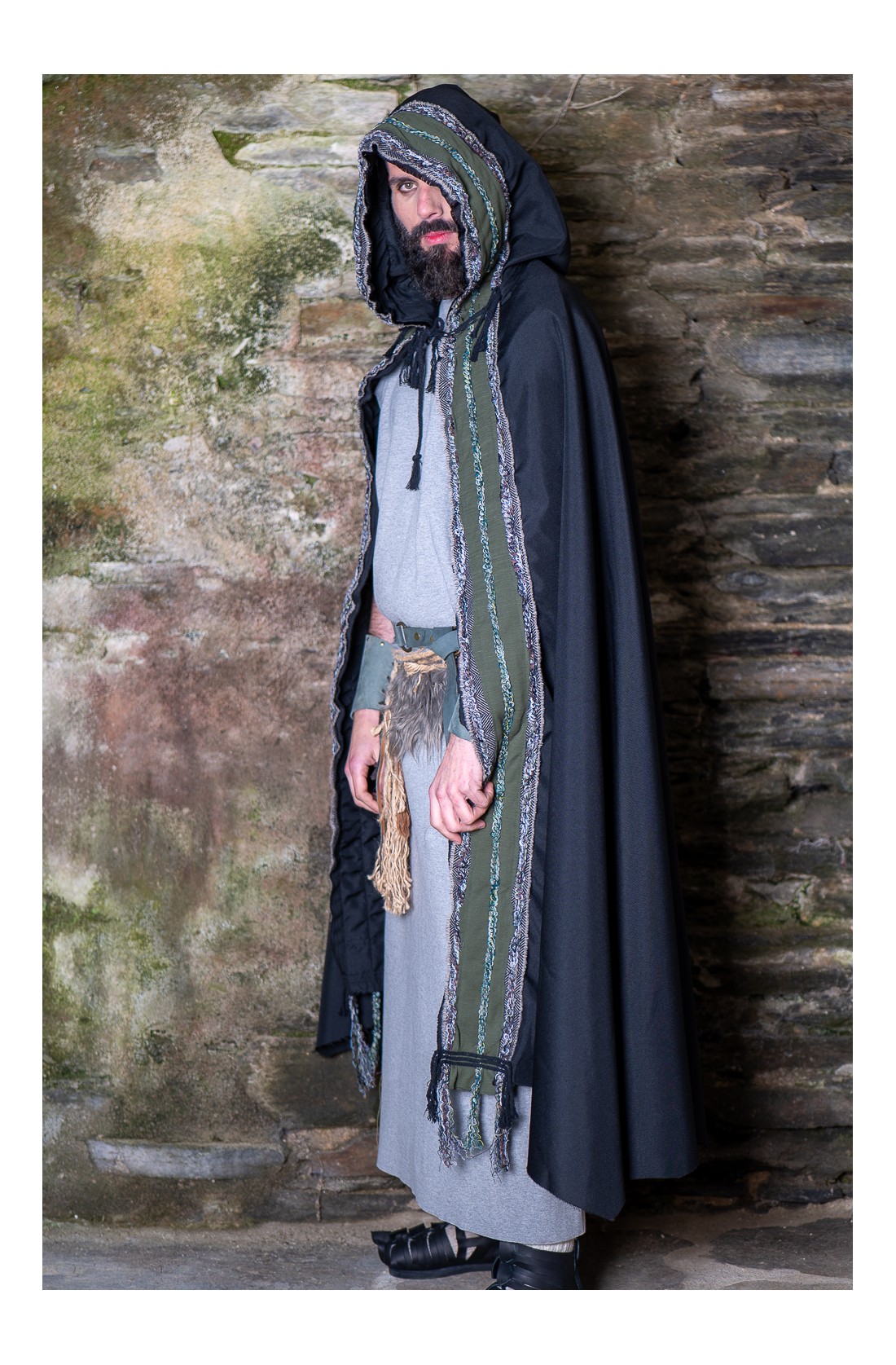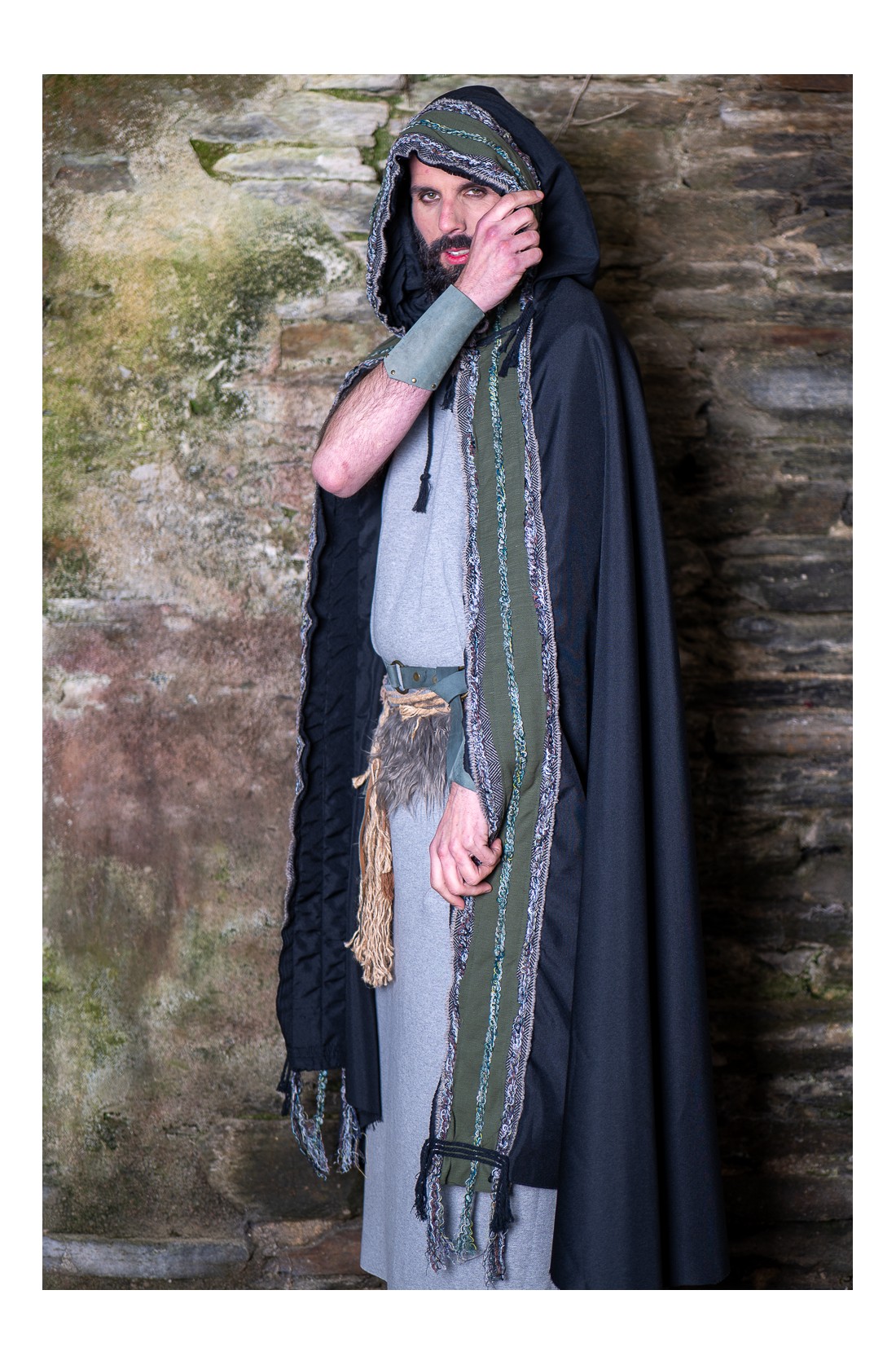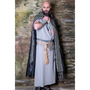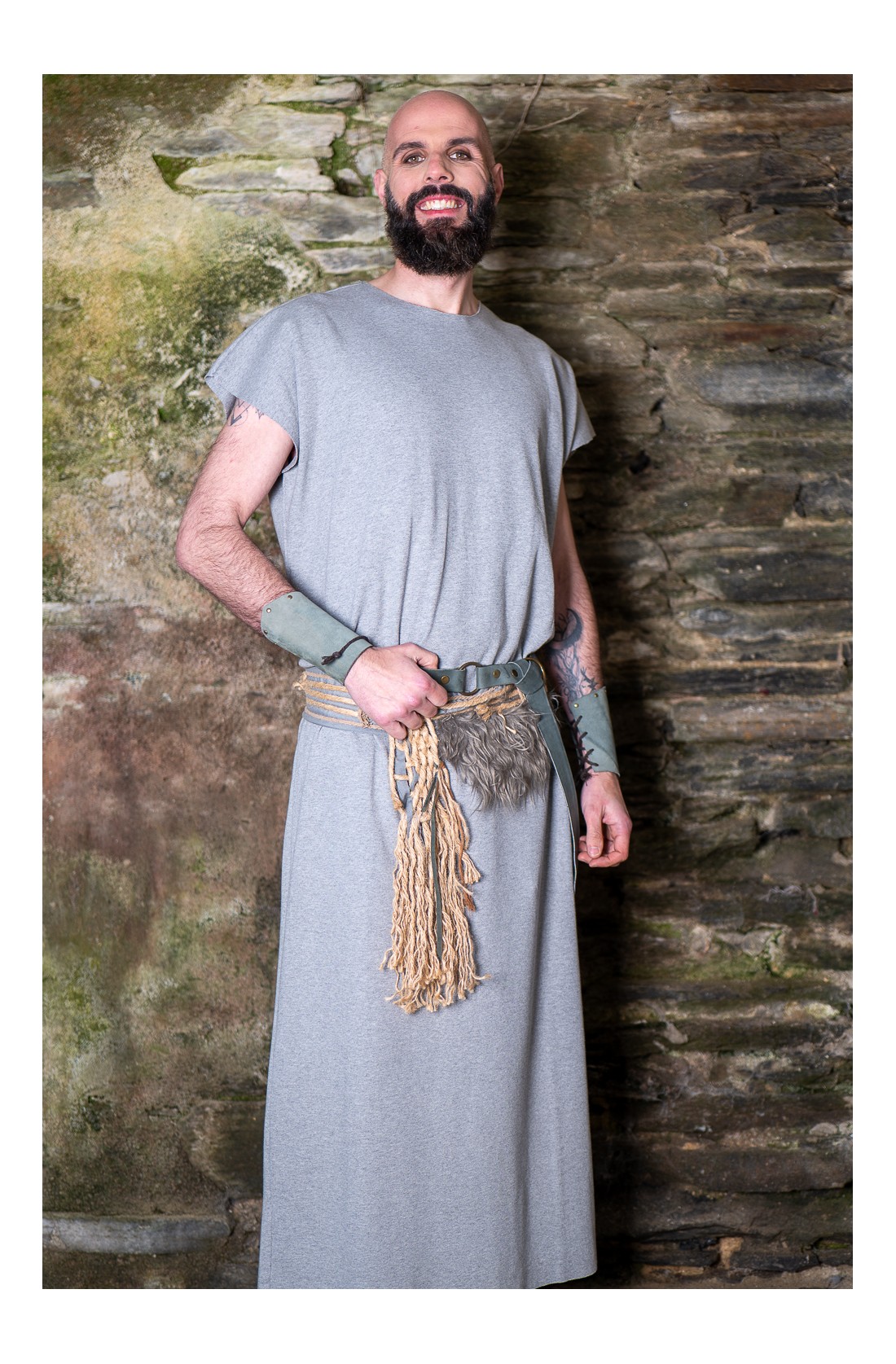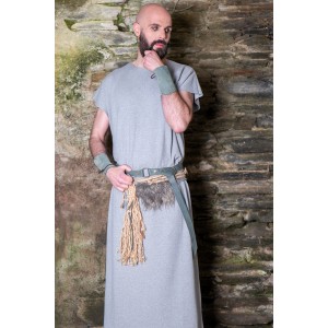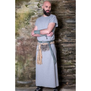 Long grey Celtic and Viking set, made up of a comfortable, roomy one-size tunic designed to build a character through layers, leather, and accessories. The set includes a fabric belt decorated with natural jute cord, braided cord, and vegan fur, along with a second leather belt and matching bracers. A rustic-looking set, designed in our workshops, that works as a starting point for shaping a fantasy, Celtic, or Viking character for fairs, historical reenactment, or LARP.