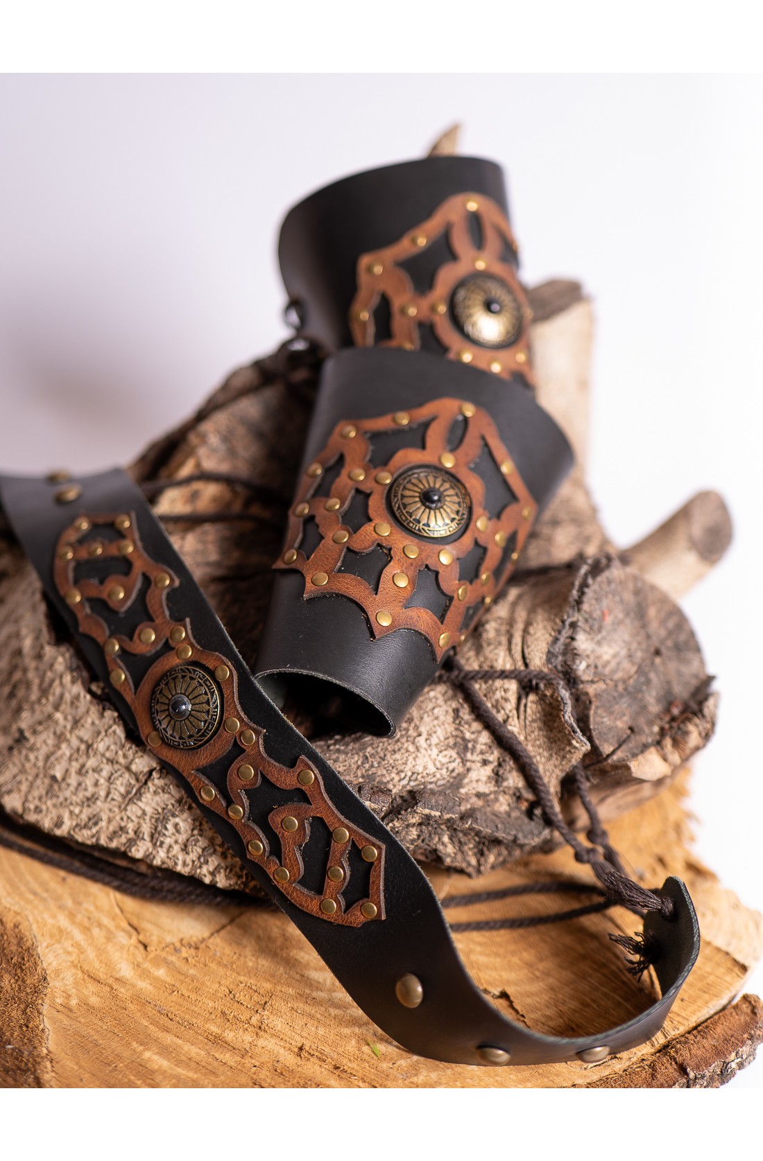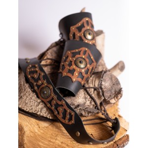 Belt and bracer set in black and brown leather, adjusted with cords and worked with aged gold-tone studs and a matching central piece. The cutout leather design creates a piece full of character, with a hard, noble, and strongly marked presence. Born in Yutecrea’s workshops, it is made to dress characters with rank and memory: a powerful sorcerer, a Viking lord from the northern lands, a Celtic man of ancient lineage, or a medieval king. It accompanies elaborate outfits and adds strength to the costume with an artisanal pulse