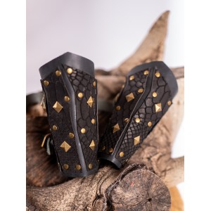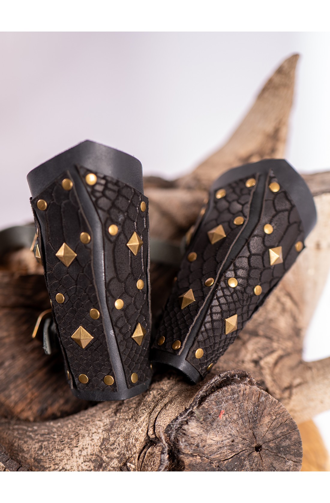 Black leather bracers with an embossed surface, aged gold-tone metal pieces, and an adjustable strap closure. The leather pattern and the arrangement of the golden details create a dark, carefully made piece with strong visual impact. Designed in Yutecrea’s workshops, they are made for a medieval lord, a medieval warrior, or a medieval nobleman. An accessory with character for fairs, historical reenactment, LARP, or fantasy characters.