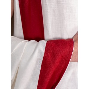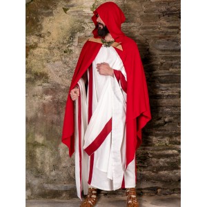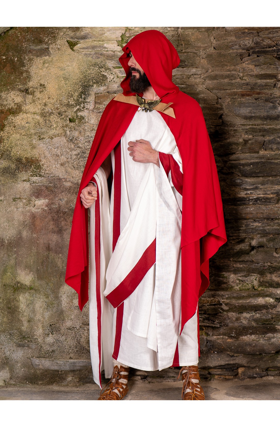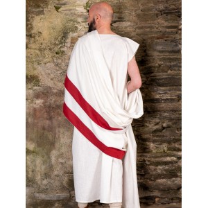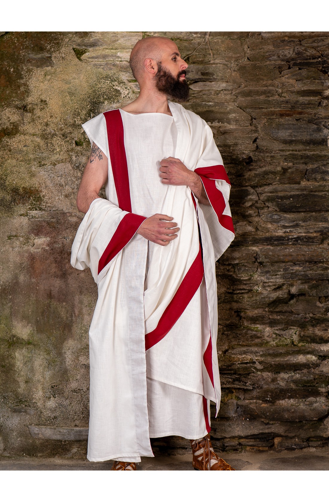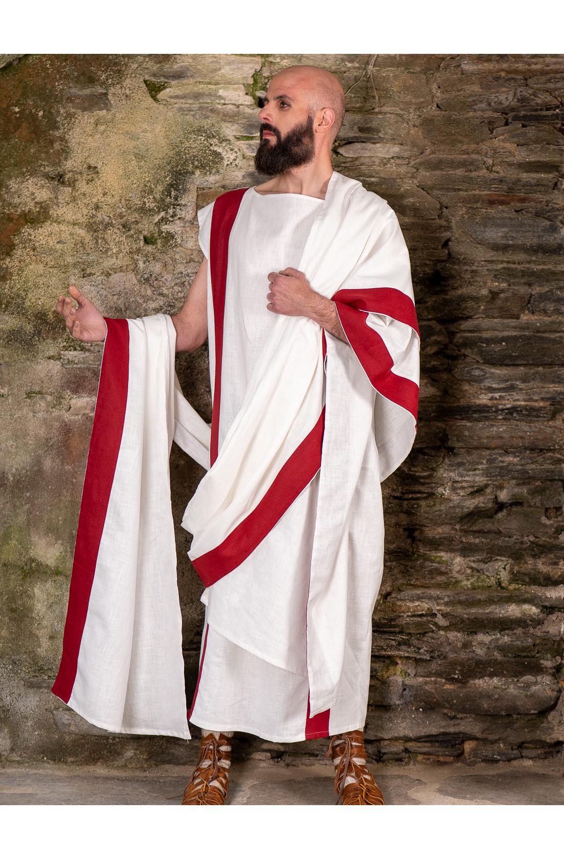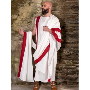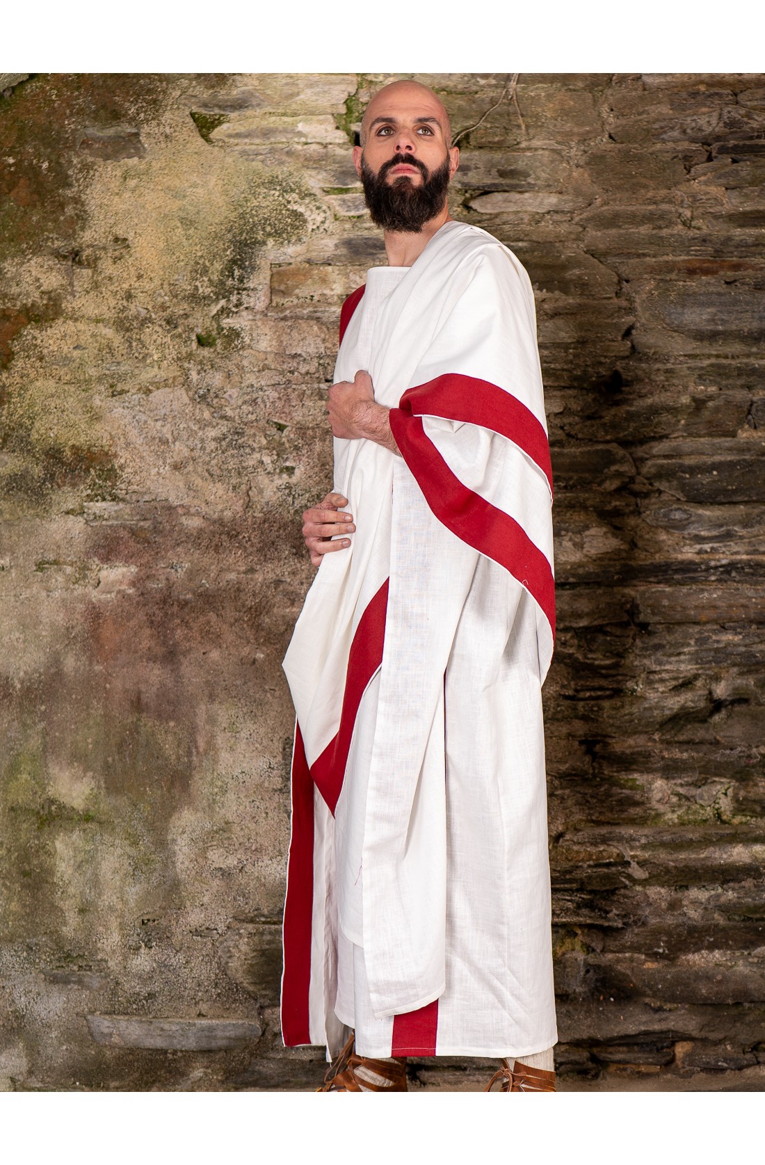 Roman senator costume made from a linen blend, ideal for creating a look that feels authentic, elegant, and true to the period. The set includes a tunic with laticlave and a striking toga praetexta measuring approximately 6 meters, with beautiful drape, volume, and the unmistakable presence of Classical Rome. In an off-white shade with red bands, it evokes authority, distinction, and power. Perfect for historical reenactment, theatre, themed events, Roman fairs, or stage costume. A visually powerful piece to portray a Roman senator with character.