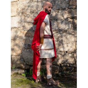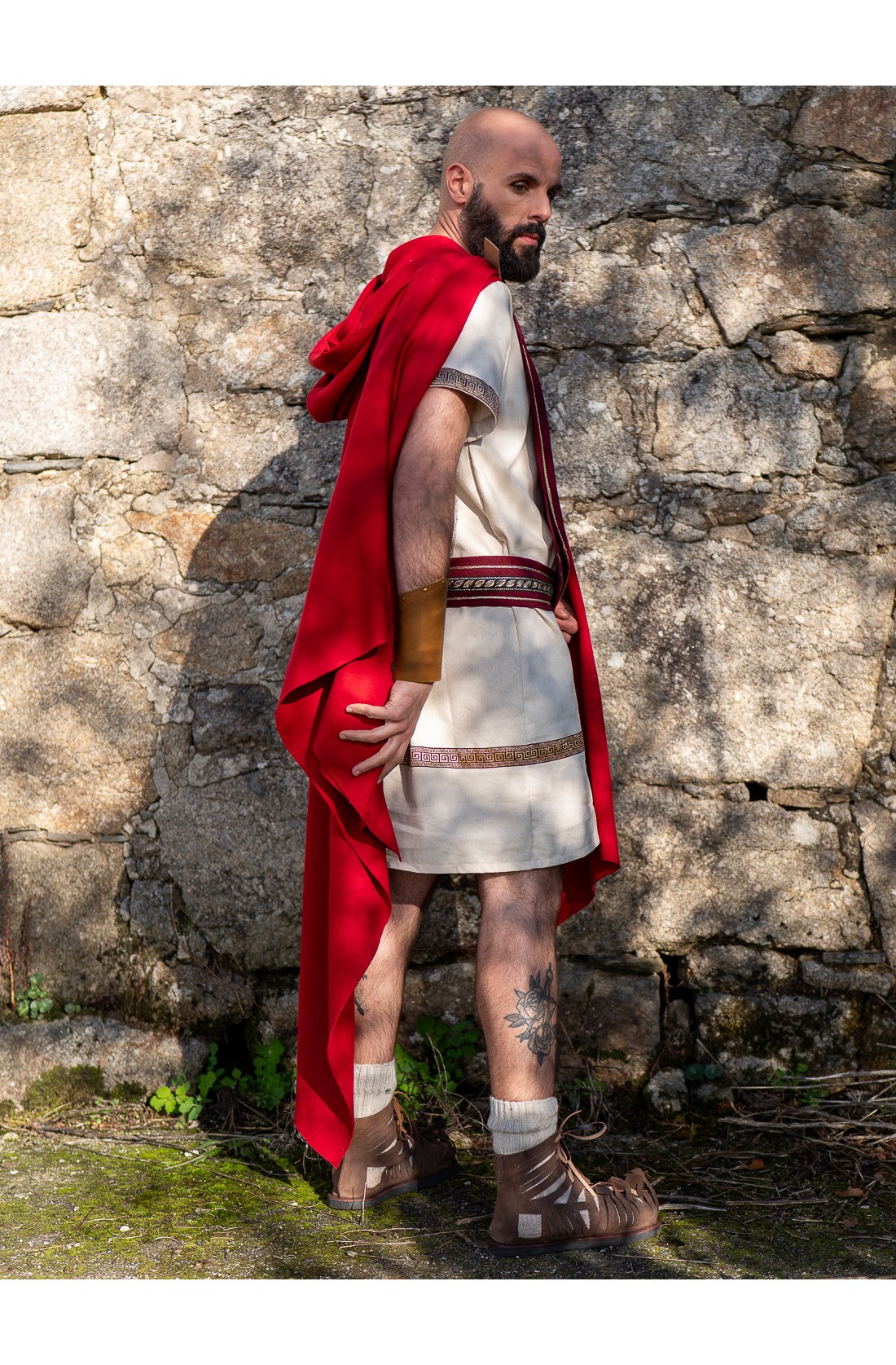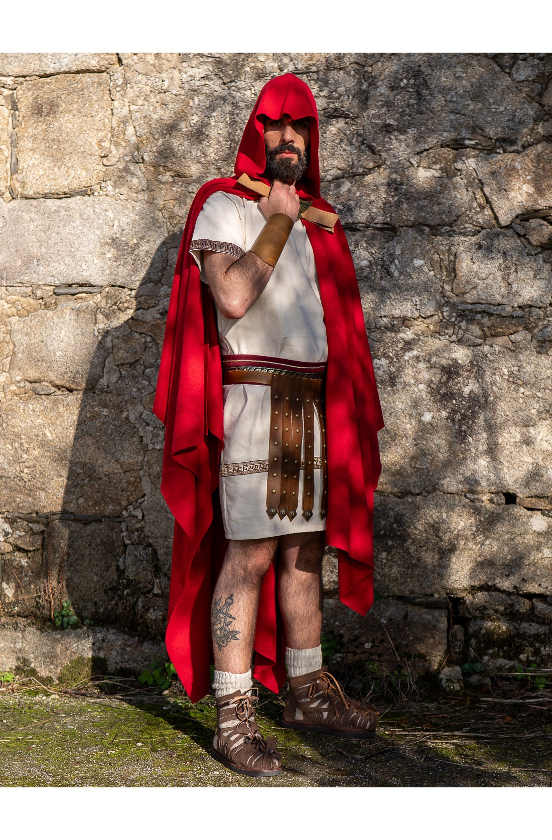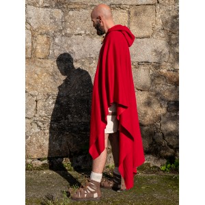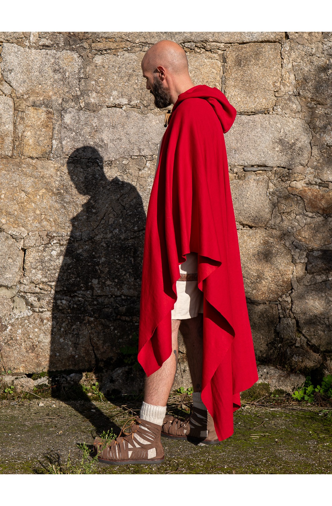 Roman red knit fabric cloak with a paenula-style pattern and hood, inspired by ancient Roman garments. At Yute Crea, we've highlighted its golden eagle metal clasp, fastened with brown leather straps, a symbol of the Roman legions and the power of Mars, the god of war. The red color was emblematic in the attire of soldiers, generals, and emperors.