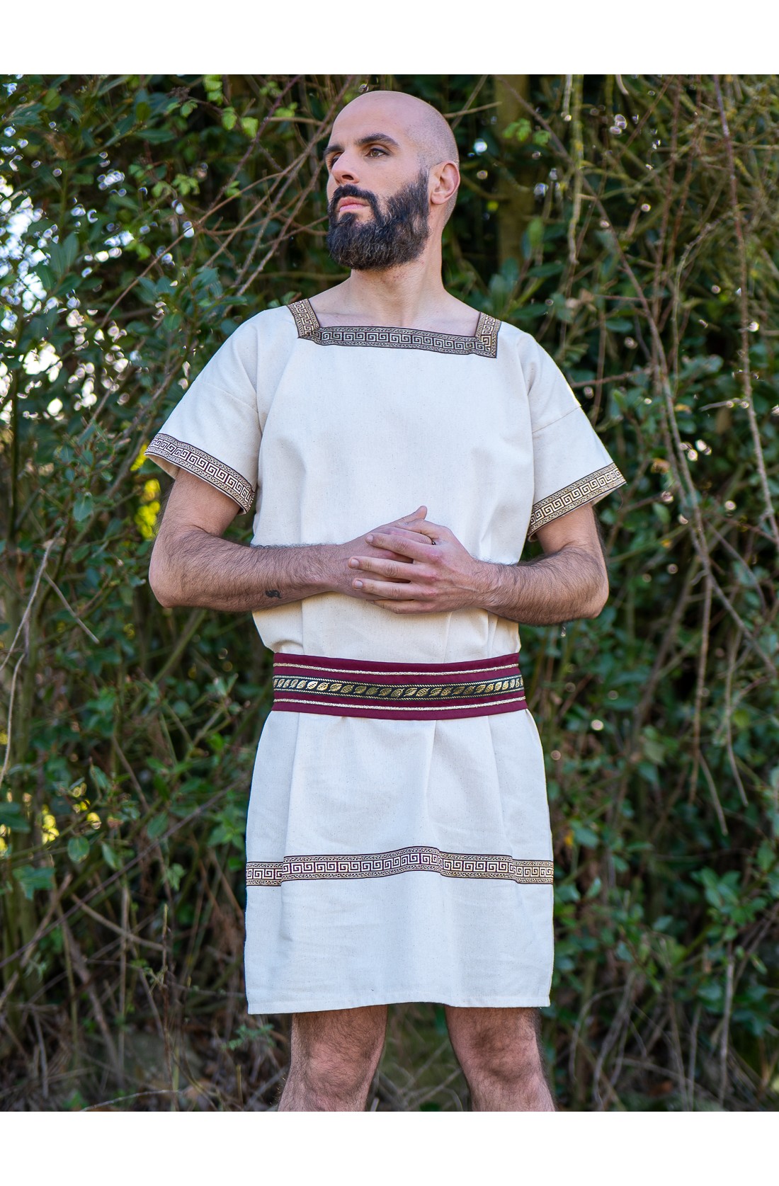 In Yute we bring this Roman bag in a rustic light colored fabric adorned with wide trimmings in maroon and gold to carry comfortably at the waist like a patrician of Rome your belongings at fairs and historical events. This item is sold separately from the gold rope belt.