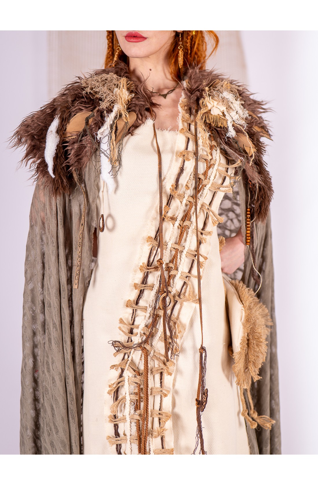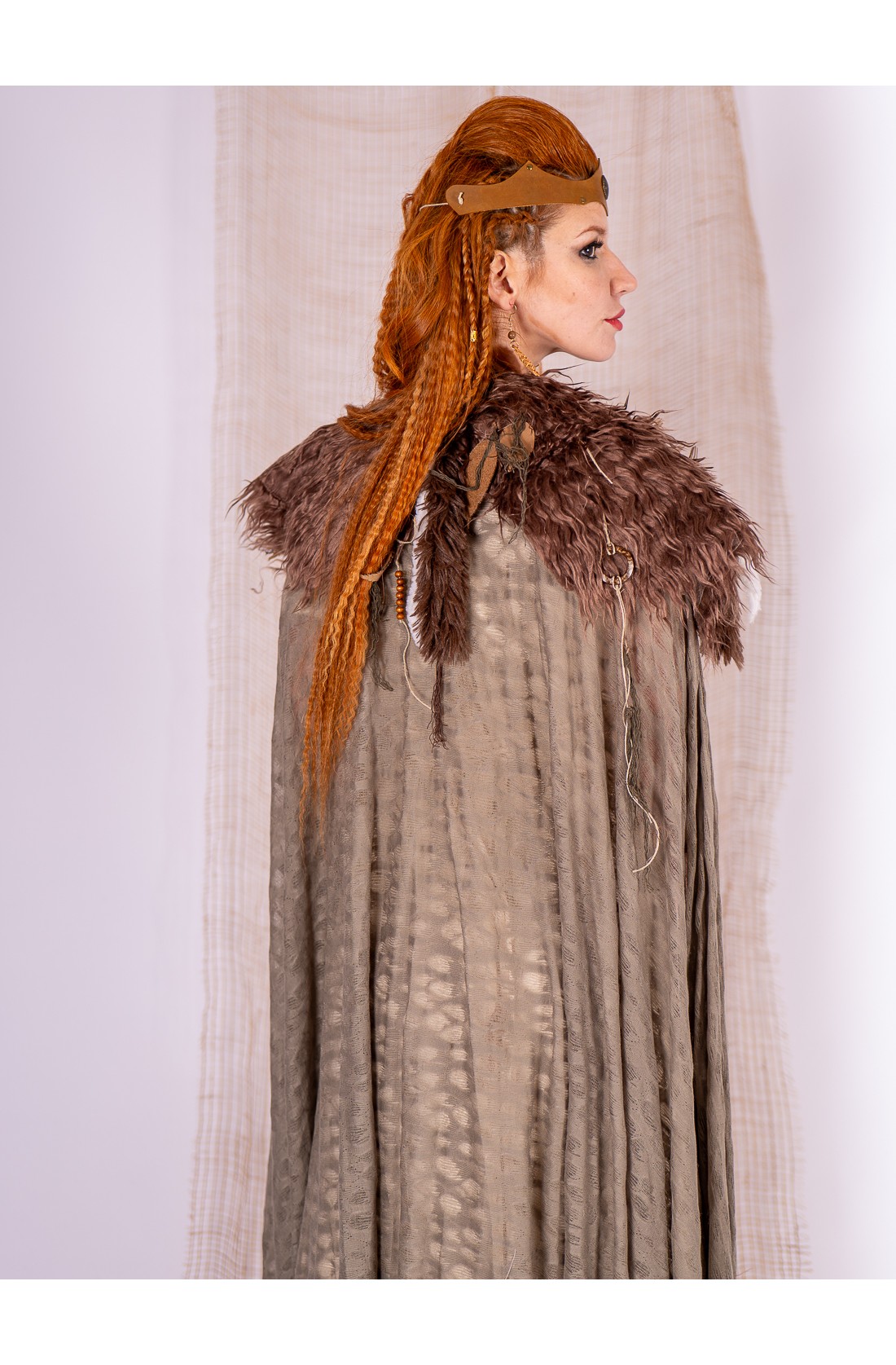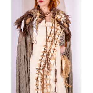 Discover the Celtic and Viking essence with our fine knit cape in greenish gray, a piece designed to enhance your presence at any historical or fantasy event. This cape, adorned with vegan fur on the shoulders, features leather leaf appliques, offering a rustic and natural elegance. The details in cord and burlap, along with wooden symbols, will immerse you in an epic and magical world.