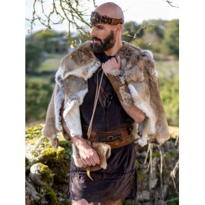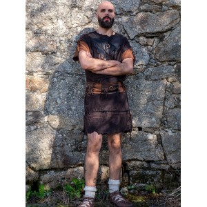 The medieval short warrior mercenary outfit for men offered by Yutecrea is a unique handcrafted piece designed to stand out at any fair or historical event. This outfit, accompanied by a matching belt, features vegan leather on the chest, circular wooden pieces, and cotton rope that add charming rusticity to the ensemble. This fresh and comfortable attire is ideal for fairs and themed events.