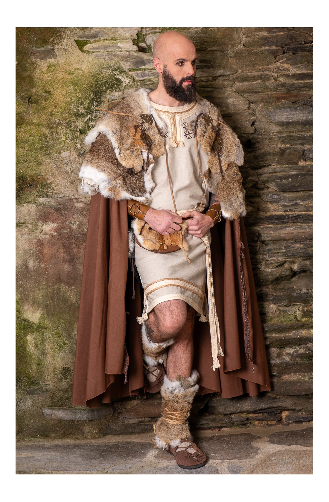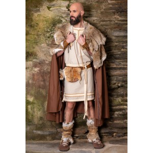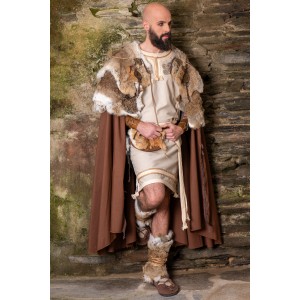 This soft and warm rabbit fur cloak is perfect for cold climates and outdoor events. It fastens with cords and metal brooches featuring Celtic details, allowing it to be worn over both shoulders or draped to one side for a more warrior-like look.