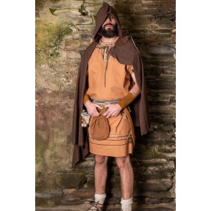 These natural leather armbraces, handcrafted and aged in Yutecrea workshops, feature warm brown tones for an authentic, worn appearance. Adorned with a pyrographed triskel, a Celtic and Viking symbol of strength and balance, they bring historical depth to your costume. Adjustable with cords, perfect for warriors, mercenaries, or hunters combined with tunics, cloaks, or leather armor.