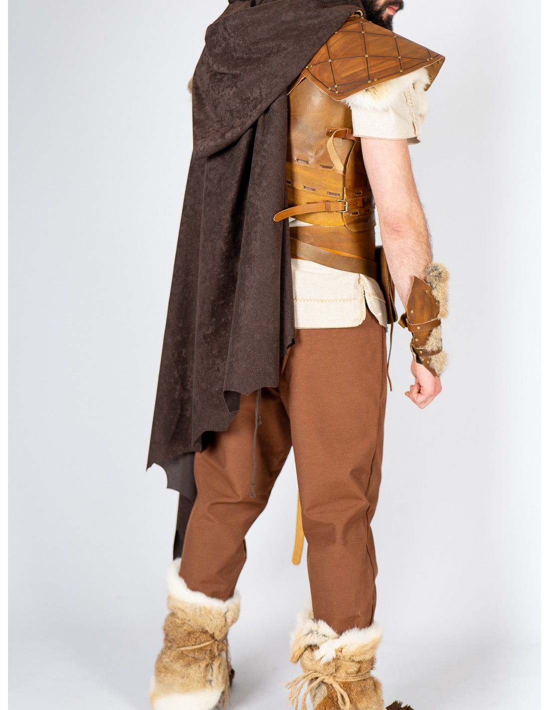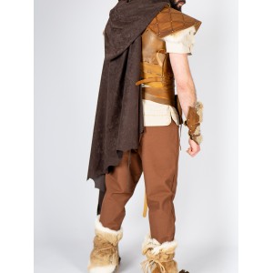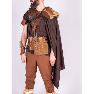 Se ajusta con tiras de cuero, lo que permite un ajuste cómodo y adaptable. Su borde irregular y el detalle de piel en los hombros refuerzan su aspecto rústico, combinando perfectamente con túnicas y cinturones de cuero para un conjunto completo.