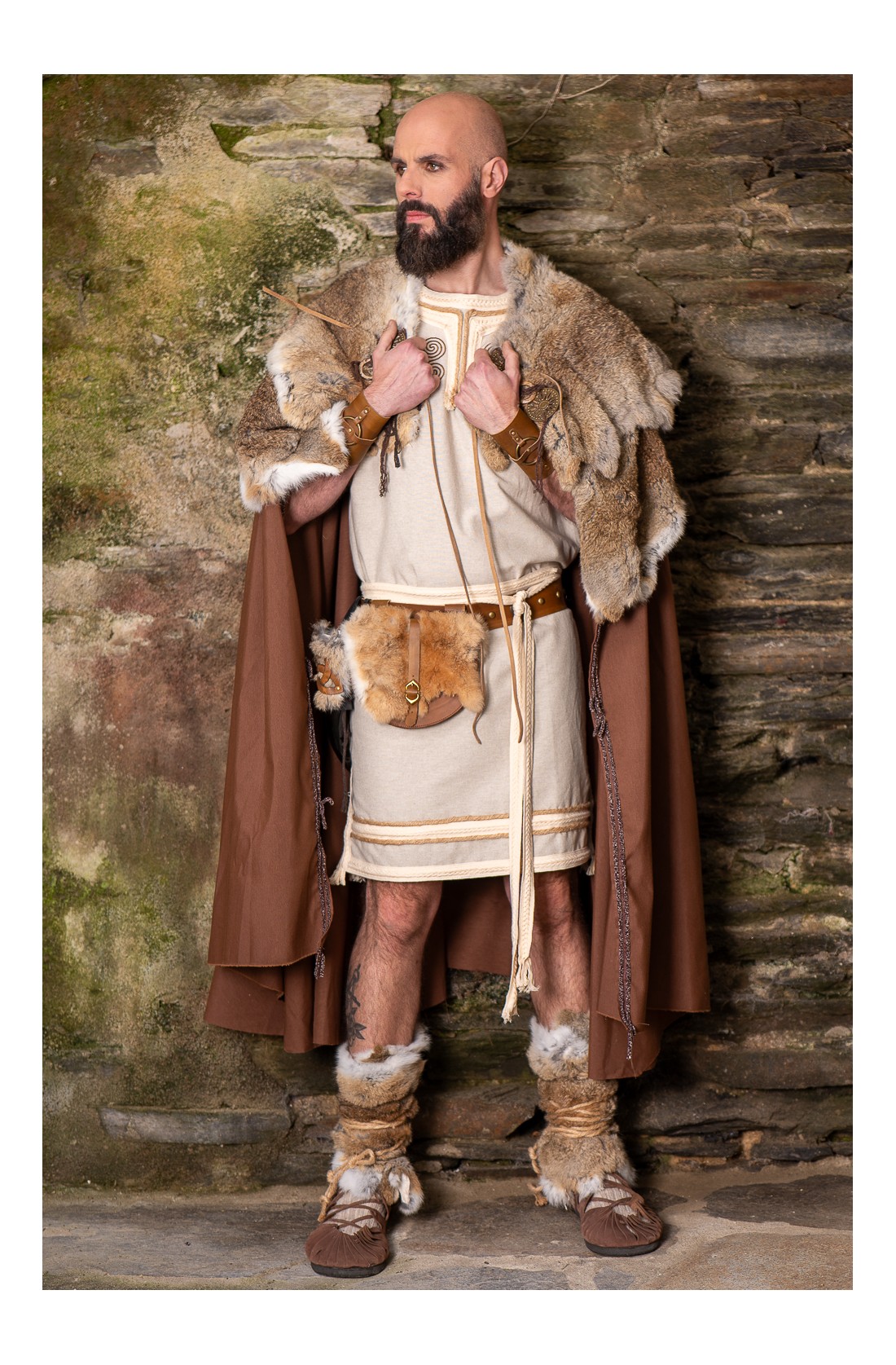 Esta cinta de cuero marrón está diseñada como adorno de cabeza, inspirada en los estilos celtas y vikingos. Lleva una pieza central metálica envejecida que recuerda a los cascos ceremoniales de estas culturas, aunque se trata de un complemento decorativo, no de protección. La cinta se combina con piel auténtica de conejo en tonos naturales, lo que aporta textura y calidez al conjunto. Es ajustable con cuerda y se adapta cómodamente a la cabeza. Perfecta para completar un vestuario de recreación histórica o para eventos LARP donde los detalles importan.