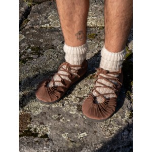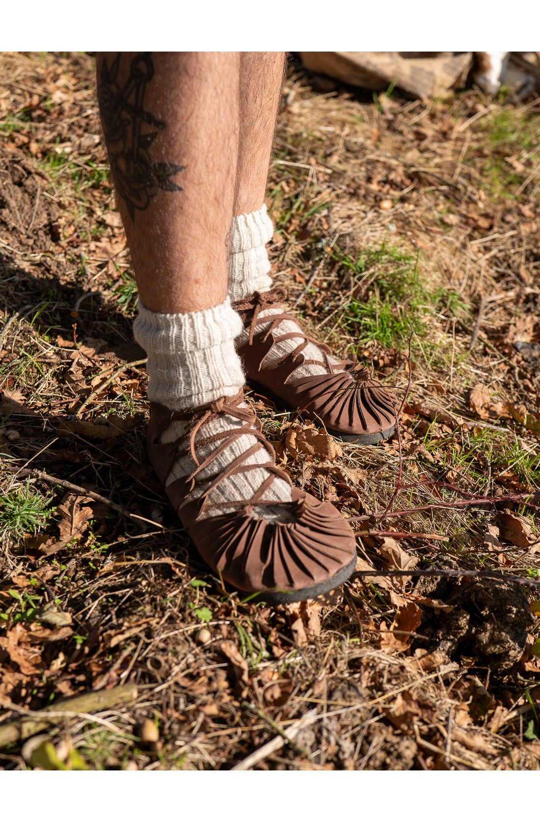 Estas piezas tienen ese aire sencillo y resistente que se ve en el calzado de las villas romanas y en los asentamientos celtas. El cuero flexible crea un ajuste agradable desde el primer paso, con una superficie suave que muestra pequeñas marcas naturales del material. La forma envolvente y la sujeción con cordones de cuero auténtico dan una sensación firme.