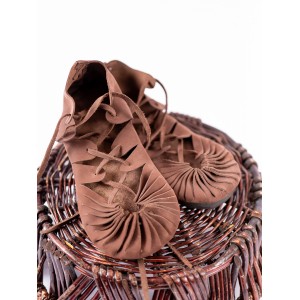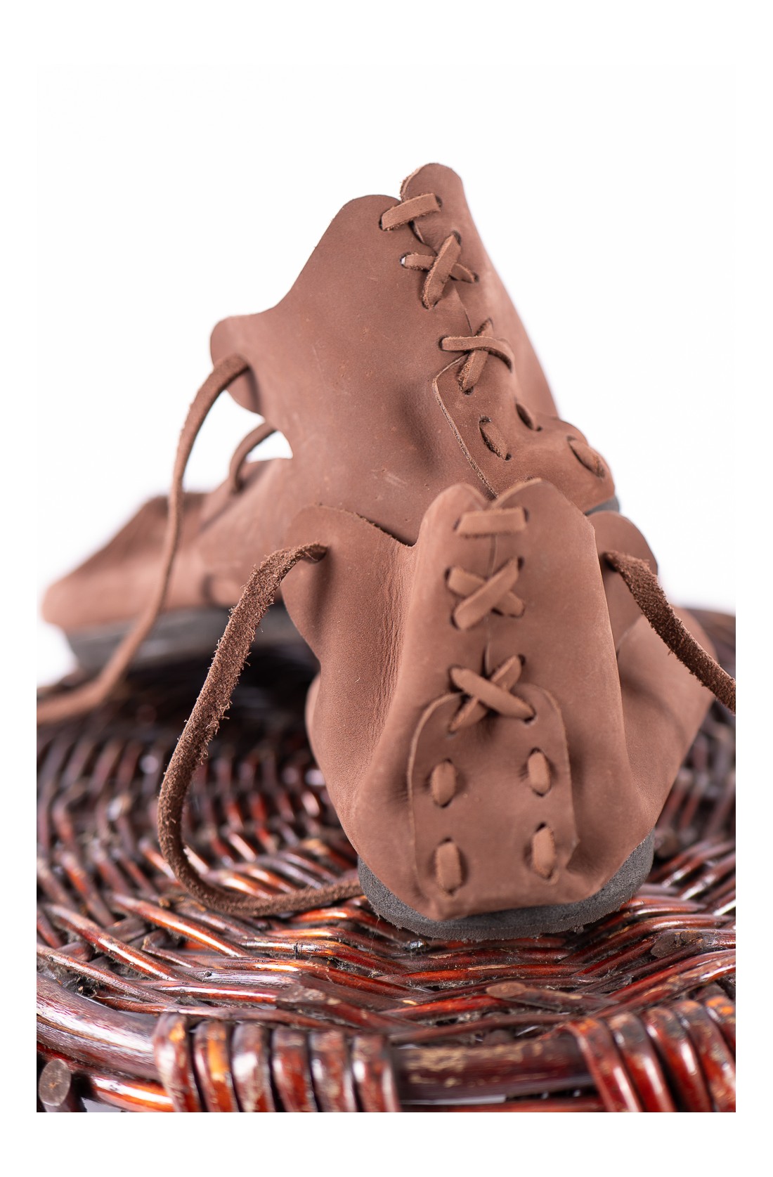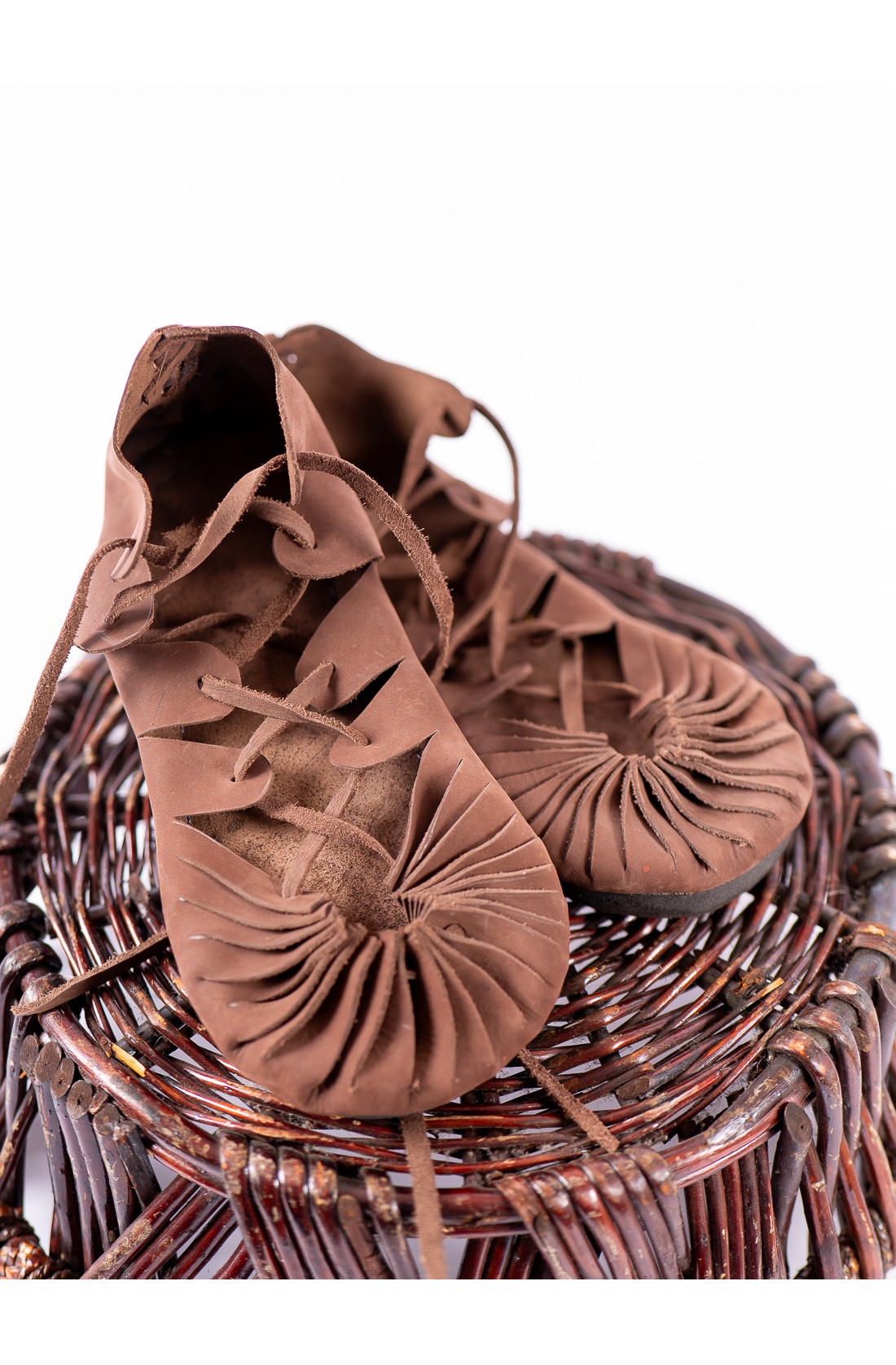 Calzado histórico confeccionado en cuero natural, trabajado en una sola pieza que se adapta al pie con el uso. La puntera fruncida recoge el material y crea el pliegue característico de las carbatinas, una de las formas más antiguas y reconocibles de calzado tradicional en Europa.
