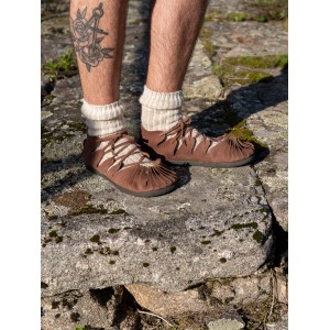 El diseño sigue modelos usados en distintas zonas del noroeste europeo: corte bajo, empeine recogido y un sistema de tiras que se adapta al pie sin apretar. Quedan muy bien con túnicas, sayas o pantalón rústico, tanto para ferias como para fiestas de recreación históricas.