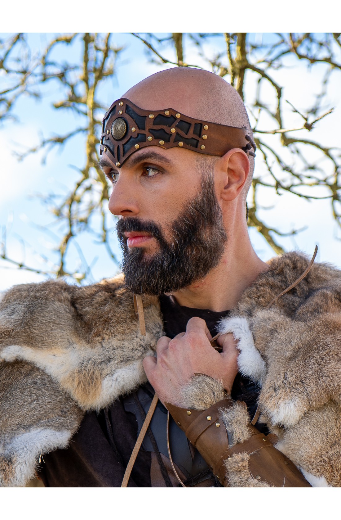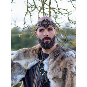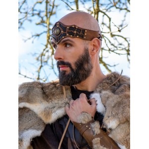 Cinta de cuero para la cabeza en tonos marrón y negro, con piezas superpuestas y remaches dorados para un guerrero celta o un conde vikingo del norte. Se ajusta con cordón en la parte trasera, se adapta bien a distintas tallas y acompaña trajes vikingos, celtas o bárbaros en ferias y LARP de Yutecrea. Artesanía cómoda y resistente, pensada para largas jornadas de recreación histórica.