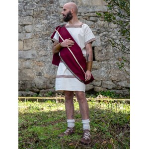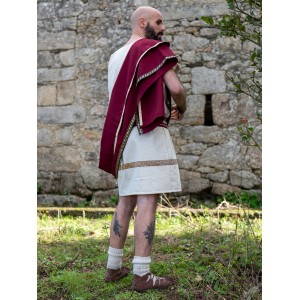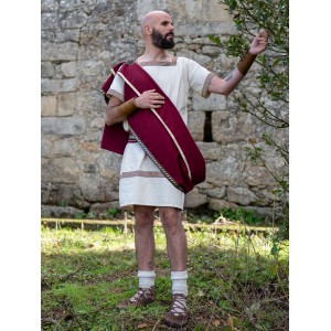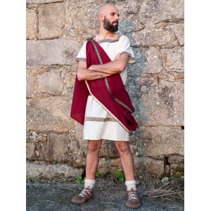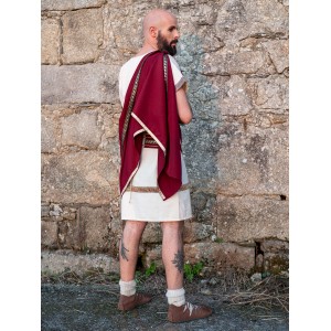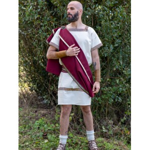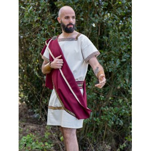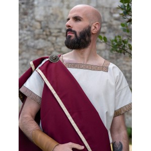 Vestimenta romana de mezcla de algodón para fiestas de recreación histórica. El blanco marfil deja ver un tejido limpio y uniforme, realzado por un cinturón en burdeos y oro que da presencia y elegancia. La toga cruza el hombro con un pliegue firme y se sujeta con un broche de león en oro viejo para llevarla con comodidad durante largas horas en un mercado o un desfile con libertad de movimiento.