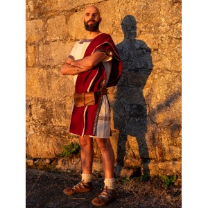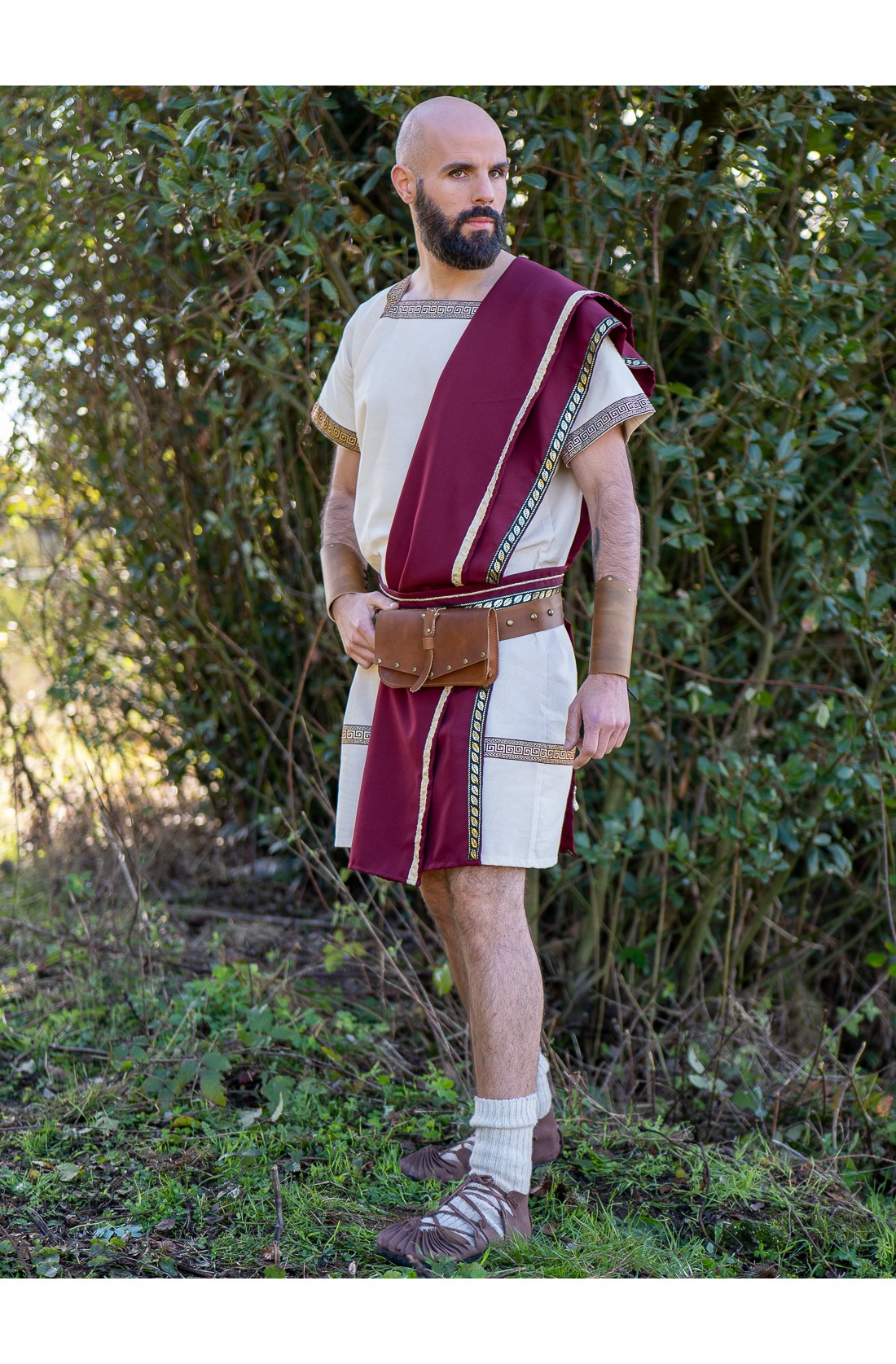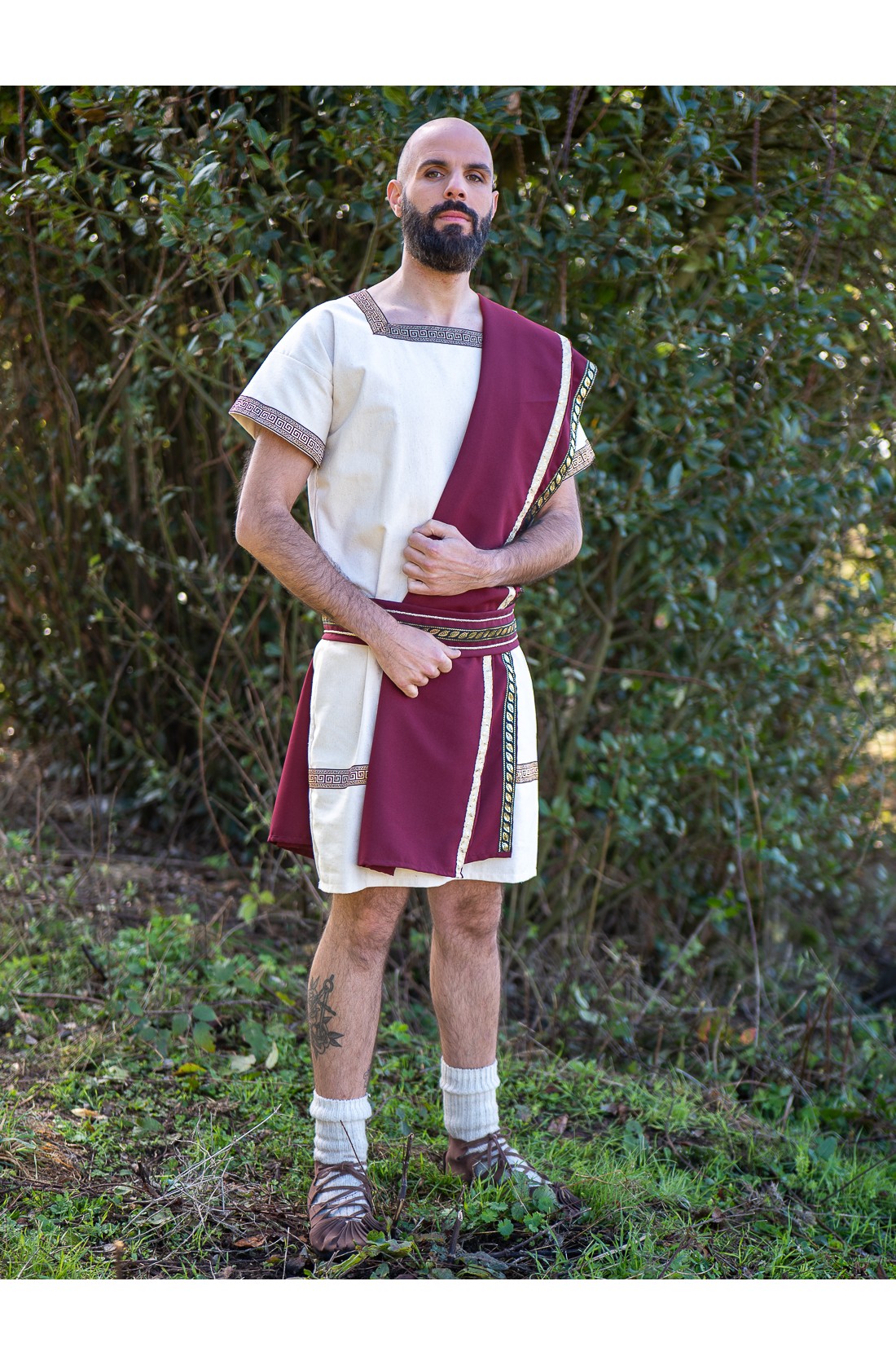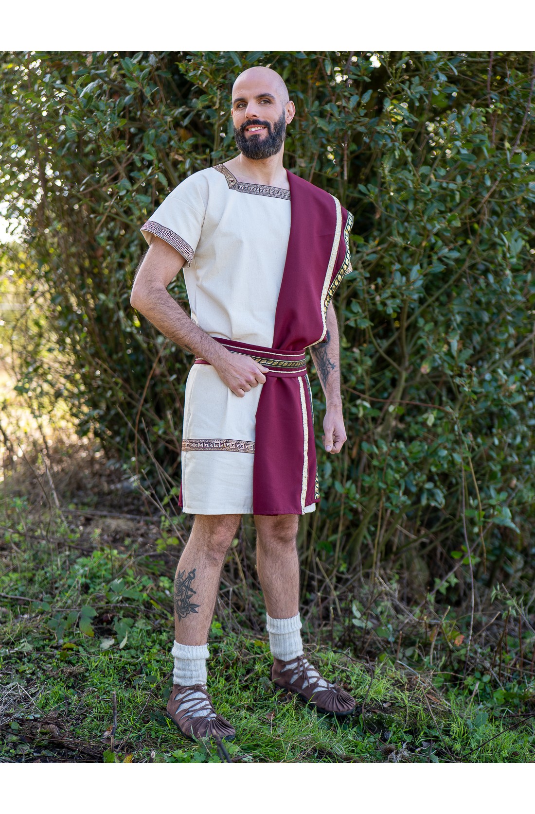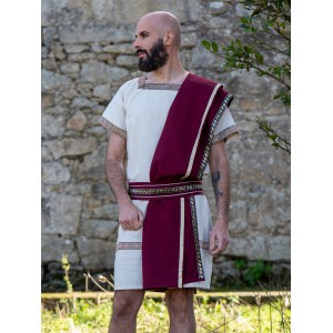 Túnica en color crudo confeccionada en los talleres de Yutecrea, pensada para recreación romana y eventos como Arde Lucus. Lleva un galón geométrico en el cuello, las mangas y el bajo, que aporta ese toque tan propio de las representaciones romanas. La toga burdeos acompaña muy bien la prenda principal y descansa sobre el hombro. El conjunto se completa con un cinturón que ajusta la silueta, una vestimenta adecuada para personajes civiles o para papeles de mayor rango dentro de la ambientación romana.