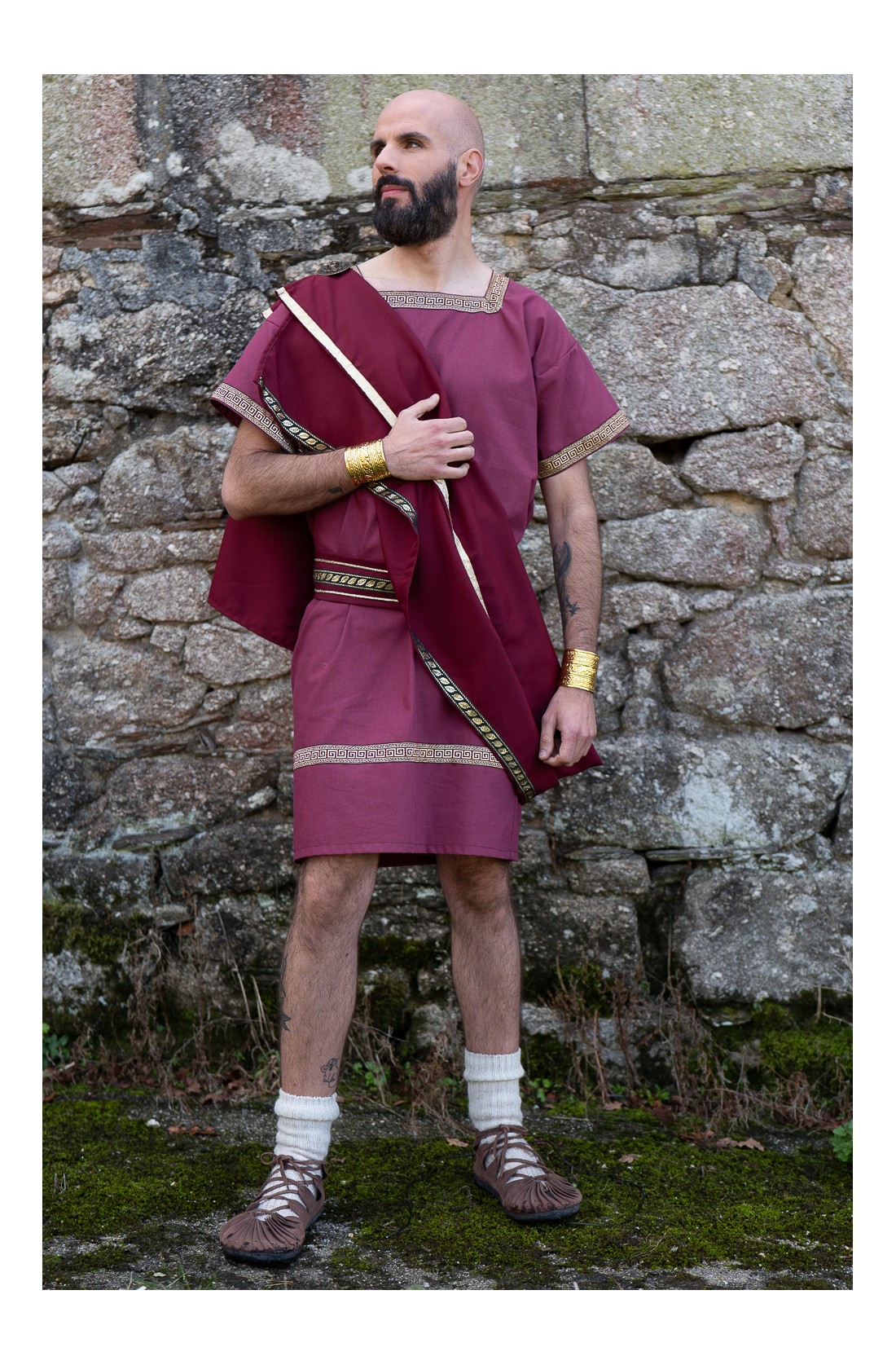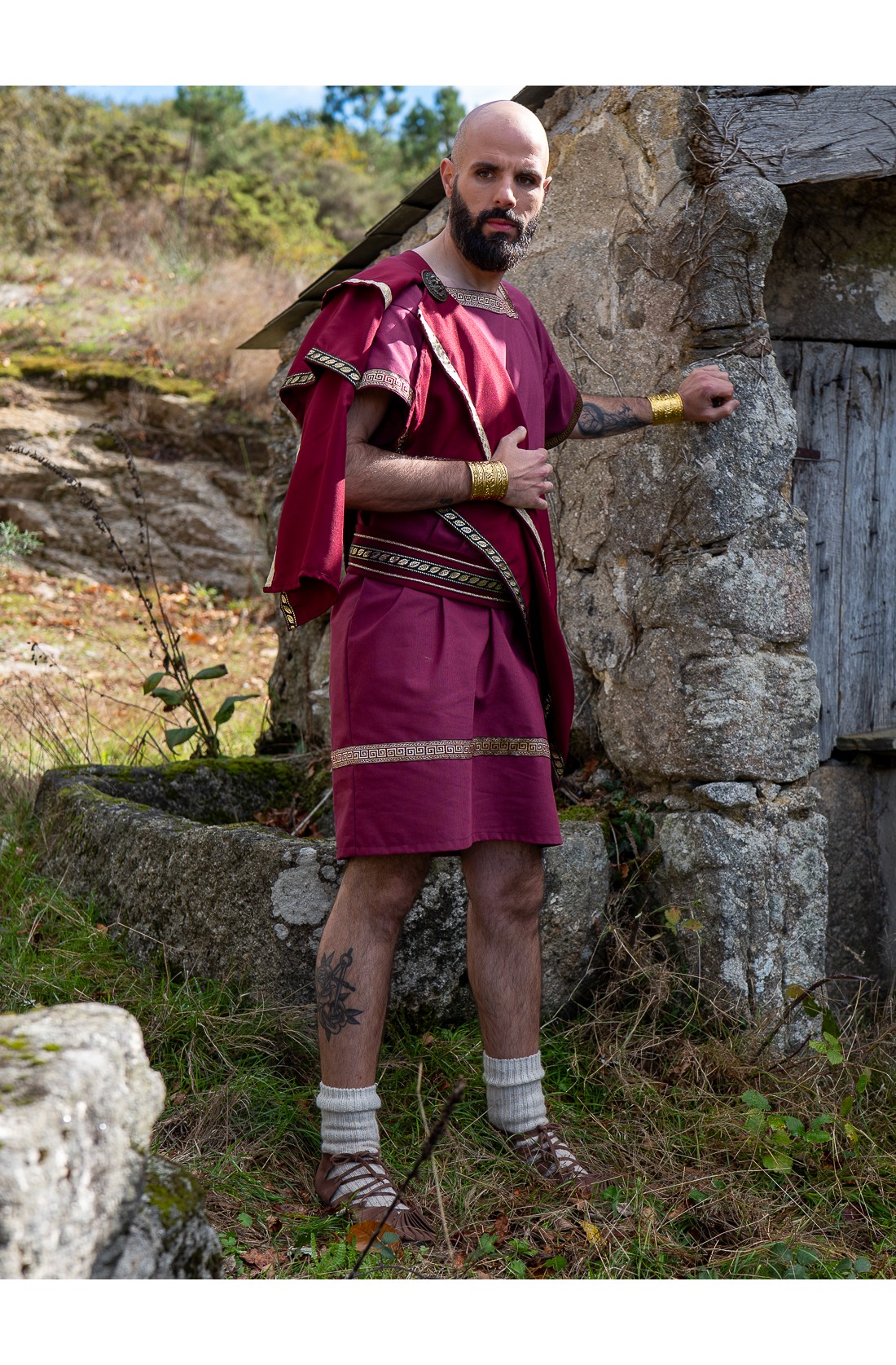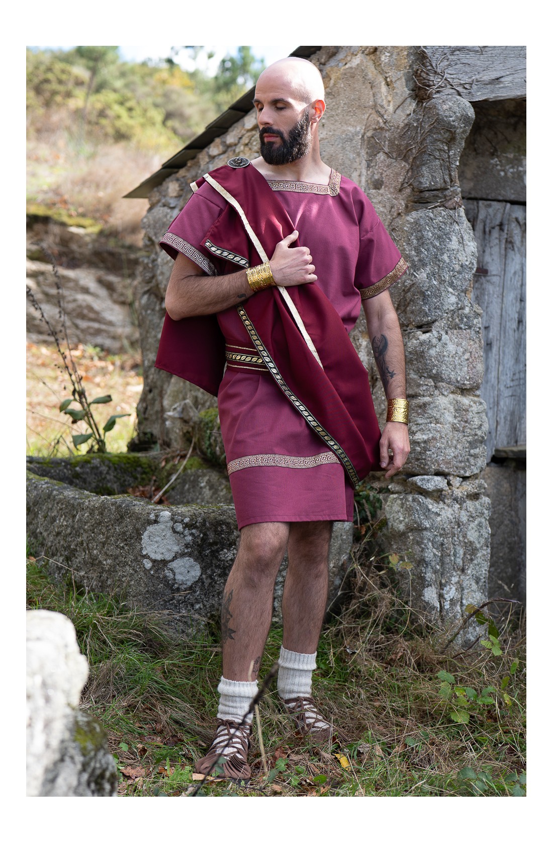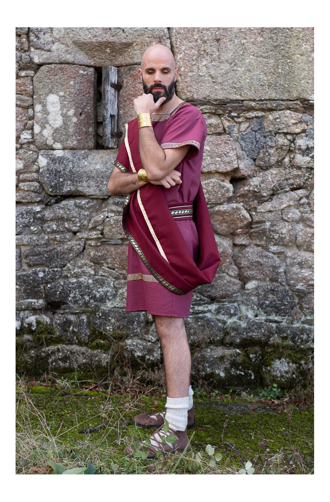 Túnica en tono burdeos diseñada en nuestros talleres de Yute crea adornada con un galón geométrico en cuello, mangas y bajo aportando un aire muy propio de la estética romana. Se ajusta con un cinturón y se acompaña con la toga a juego, que descansa sobre el hombro gracias a un broche metálico. Pensada para ferias romanas, Arde Lucus y recreación histórica, mantiene una presencia sobria que encaja bien en este tipo de eventos. Brazaletes no incluidos.