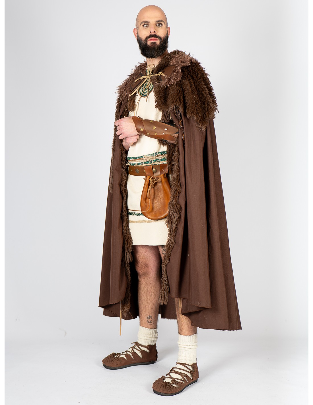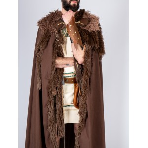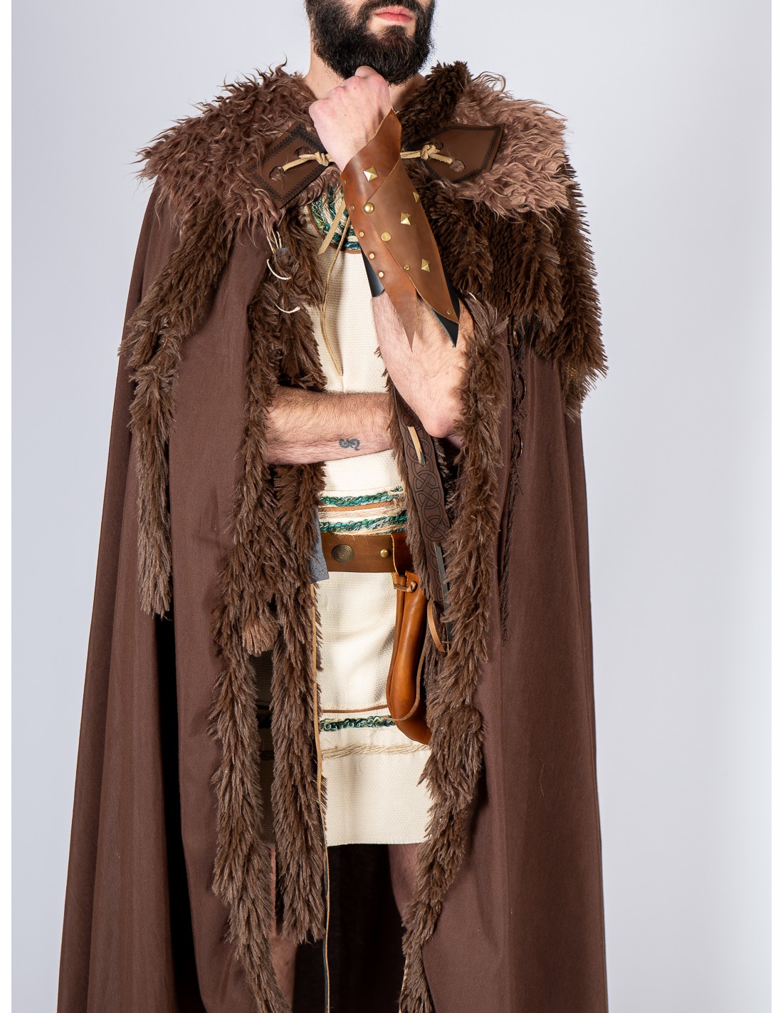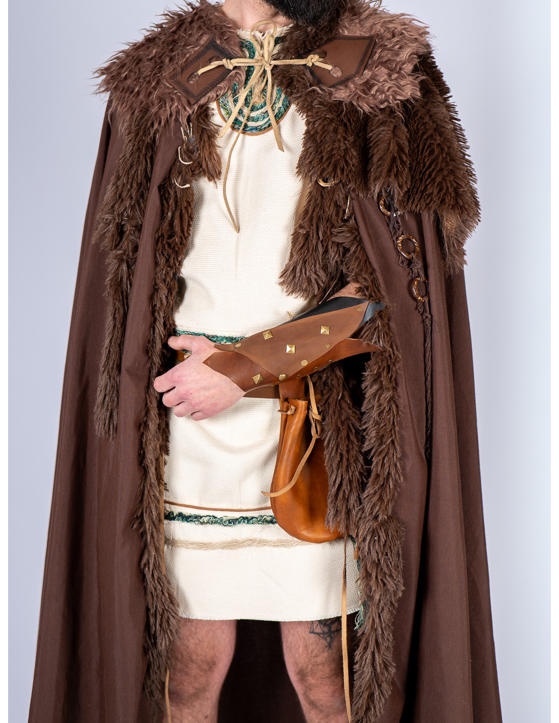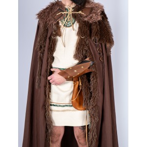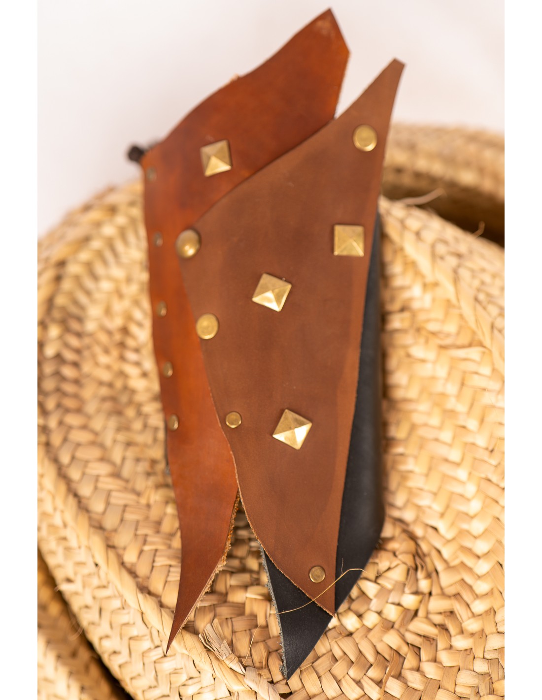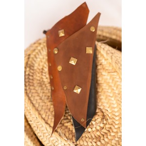 Muñequera de cuero con acabado envejecido en tonos marrones y negros, diseñada en los talleres de Yute Crea. Este brazal medieval incorpora remaches y tachuelas metálicas en tono dorado envejecido, aportando un carácter robusto y auténtico. Se ajusta con cuerda de cuero, permitiendo una adaptación cómoda a distintas tallas. Inspirada en diseños medievales, celtas y vikingos, es un complemento ideal para guerreros, mercenarios y aventureros de LARP o recreación histórica. Un accesorio versátil que encaja tanto en hombres como en mujeres, aportando un aire combativo a cualquier vestimenta.