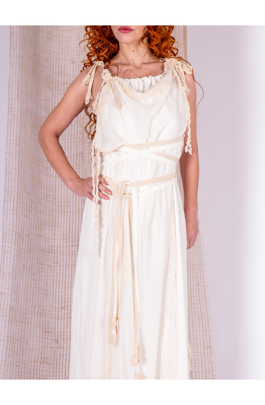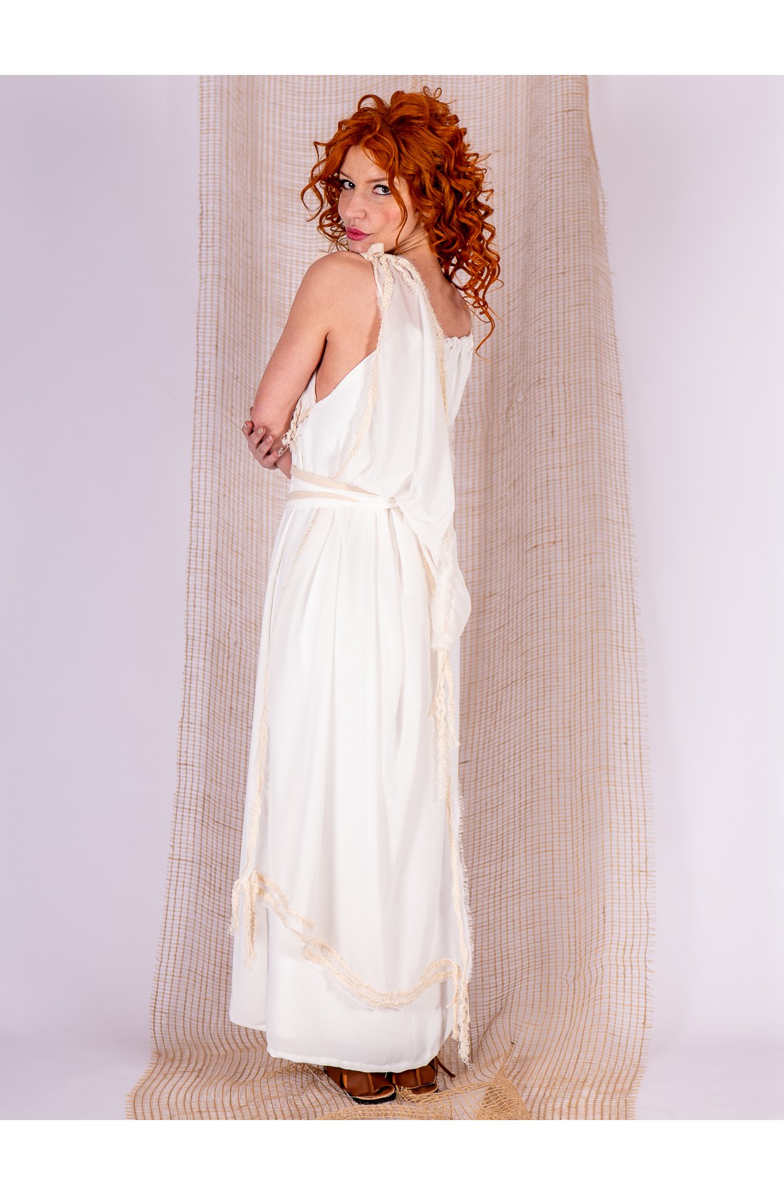 Conjunto romano compuesto por dos piezas. La base es un vestido blanco de caída fluida, con cintas incorporadas que cruzan la cintura y permiten ajustar y adornar la silueta con suavidad. El tejido forma pliegues naturales que acompañan el movimiento.