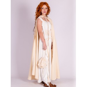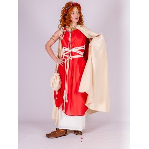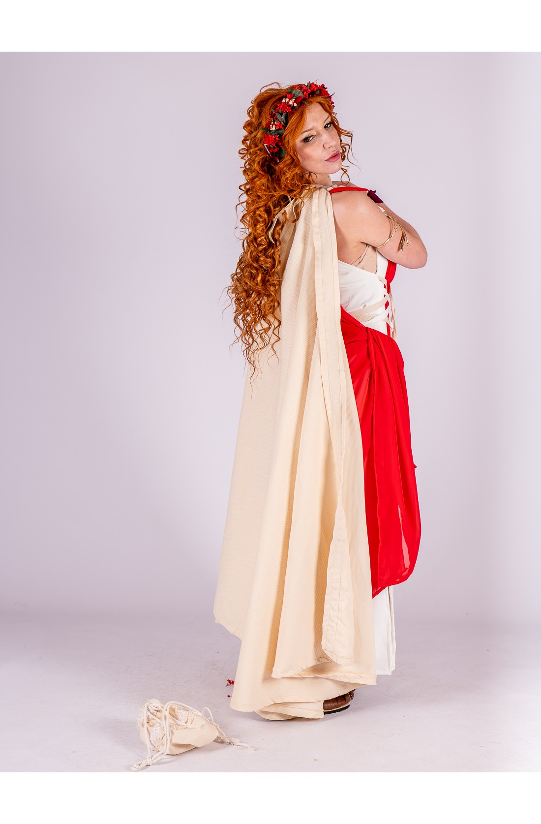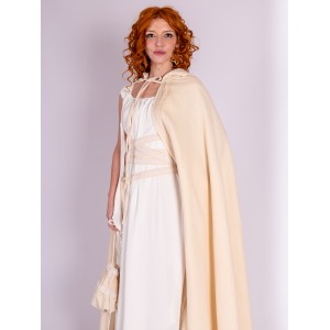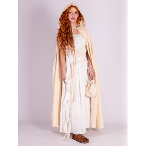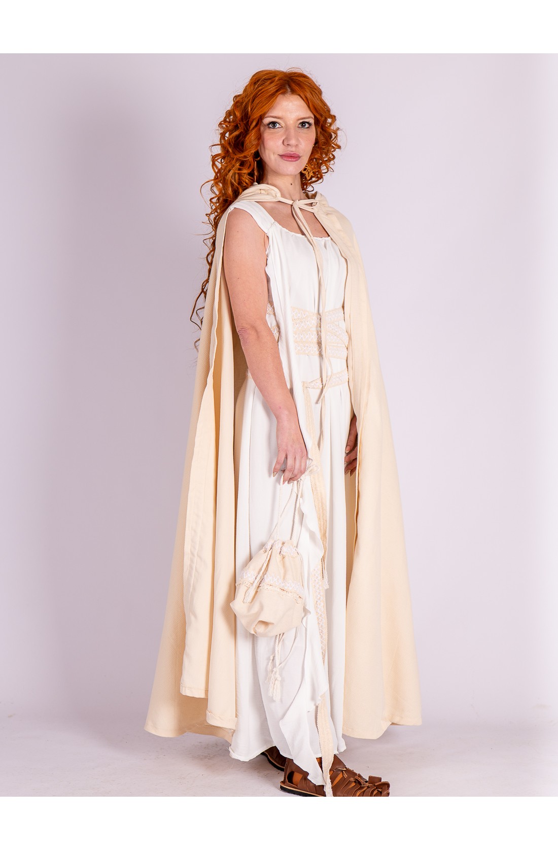 Capa de inspiración romana confeccionada en tejido ligero en tono crudo natural, con caída amplia y fluida que envuelve el cuerpo con elegancia. Su diseño largo aporta movimiento y presencia, acompañando el gesto y el paso con suavidad.