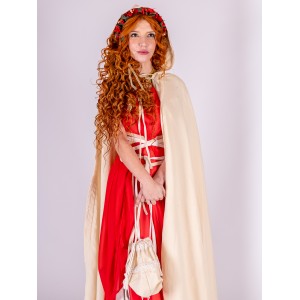 La capucha integrada permite distintas formas de llevarla: caída sobre los hombros, colocada sobre la cabeza o combinada con diademas y velos para un aire más ceremonial. Se ajusta mediante cintas en la parte frontal, manteniendo una línea limpia y equilibrada.
