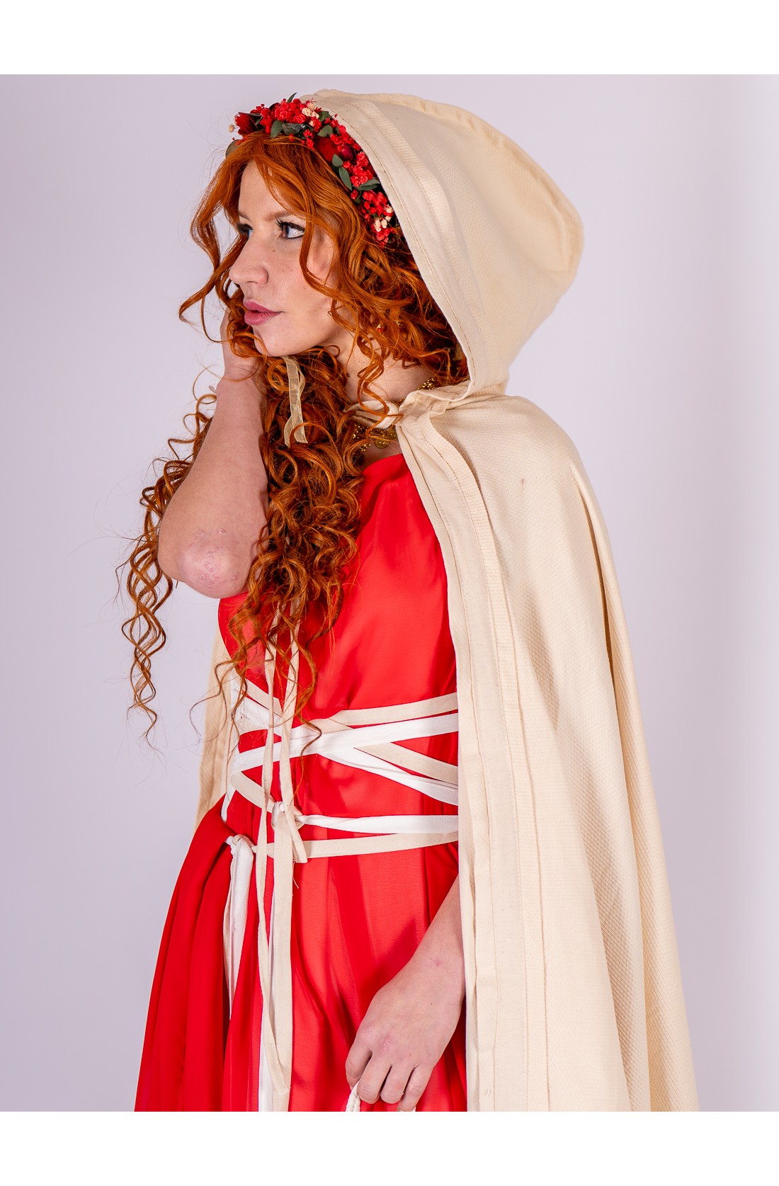 Diadema de inspiración romana elaborada con flores secas en una gama intensa de rojos y burdeos, combinadas con pequeños detalles vegetales que aportan contraste y profundidad. La composición crea un efecto natural y silvestre, ideal para completar vestimenta romana, recreación histórica de Roma o estilismos ceremoniales.