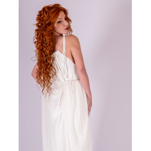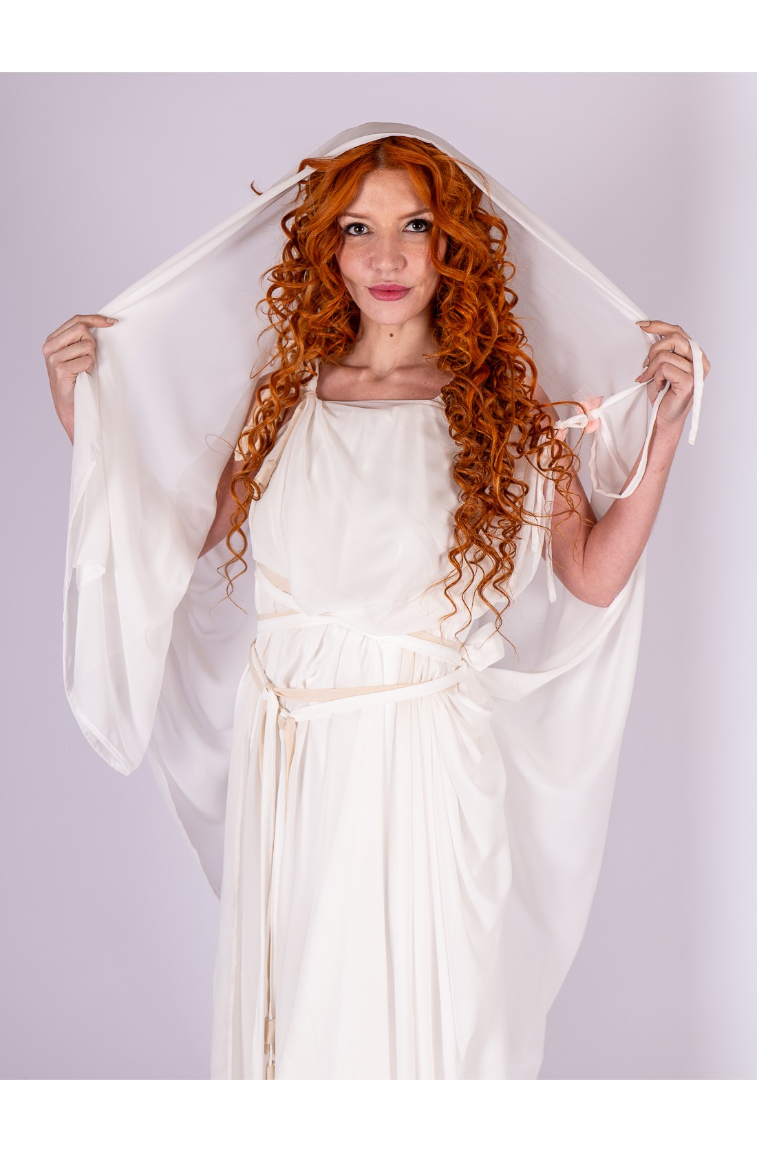 Conjunto formado por una base de vestido blanco de caída fluida y un amplio tejido de gasa superpuesto. La pieza superior mide aproximadamente 3 metros por 1,20 m, lo que permite crear pliegues generosos y una caída envolvente alrededor del cuerpo.