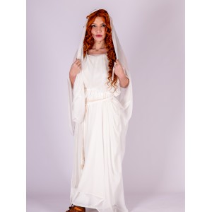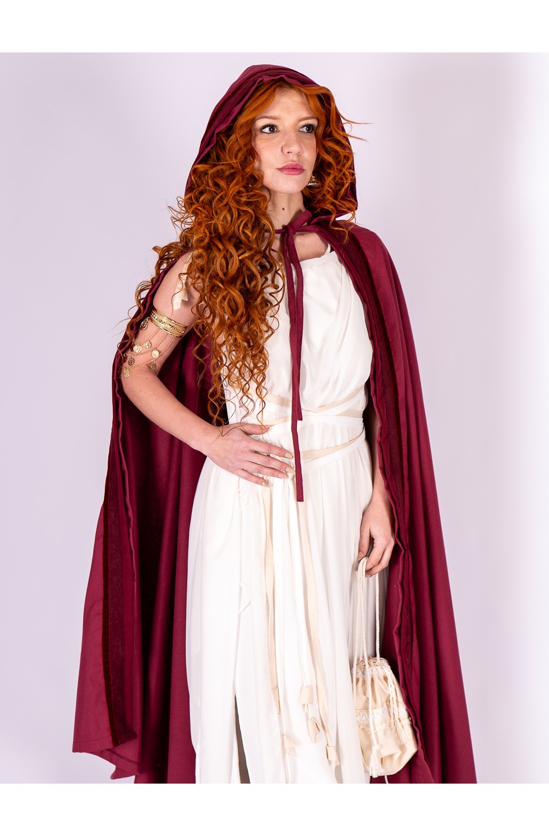 La gasa es ligera y translúcida, se mueve con el aire y añade movimiento al conjunto sin aportar peso. Incorpora lazos para sujetarla al vestido y adaptarla según la forma en que se quiera colocar. Puede llevarse suelta, cruzada sobre el torso o cubriendo la cabeza a modo de velo, creando distintas siluetas dentro de una misma pieza. Una propuesta pensada para recreación histórica romana y ambientaciones ceremoniales.