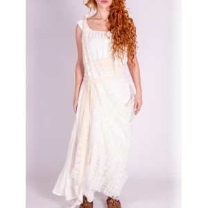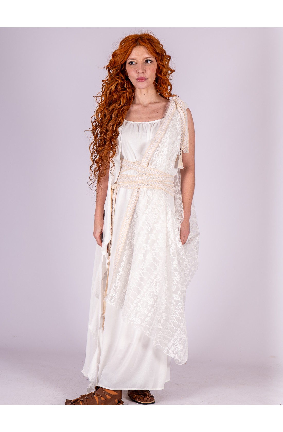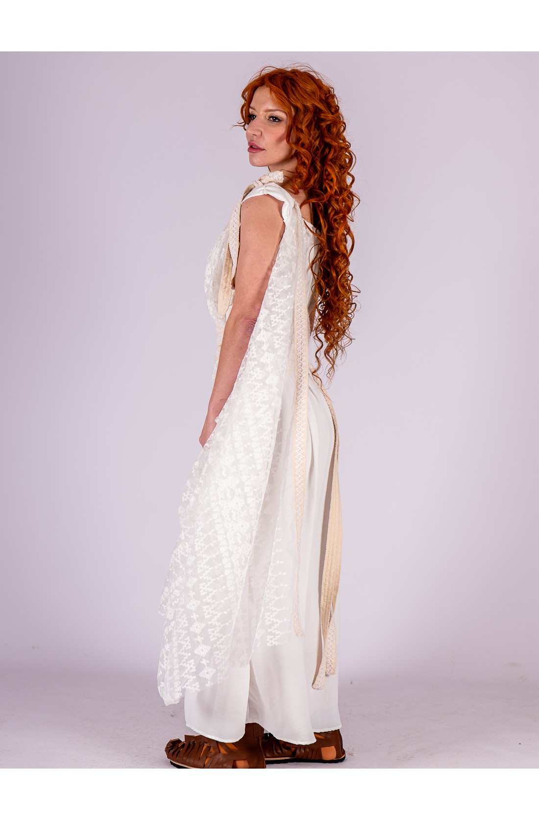 Vestido romano blanco con manto de encaje geométrico