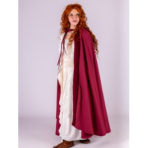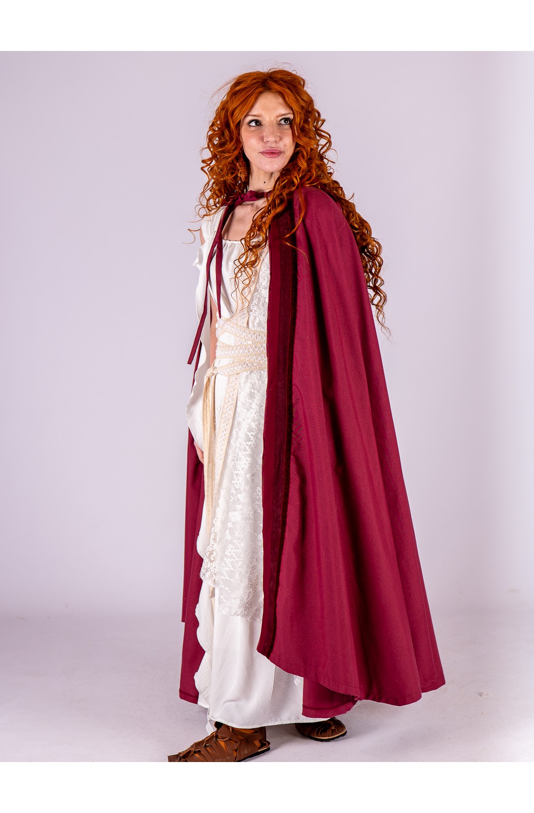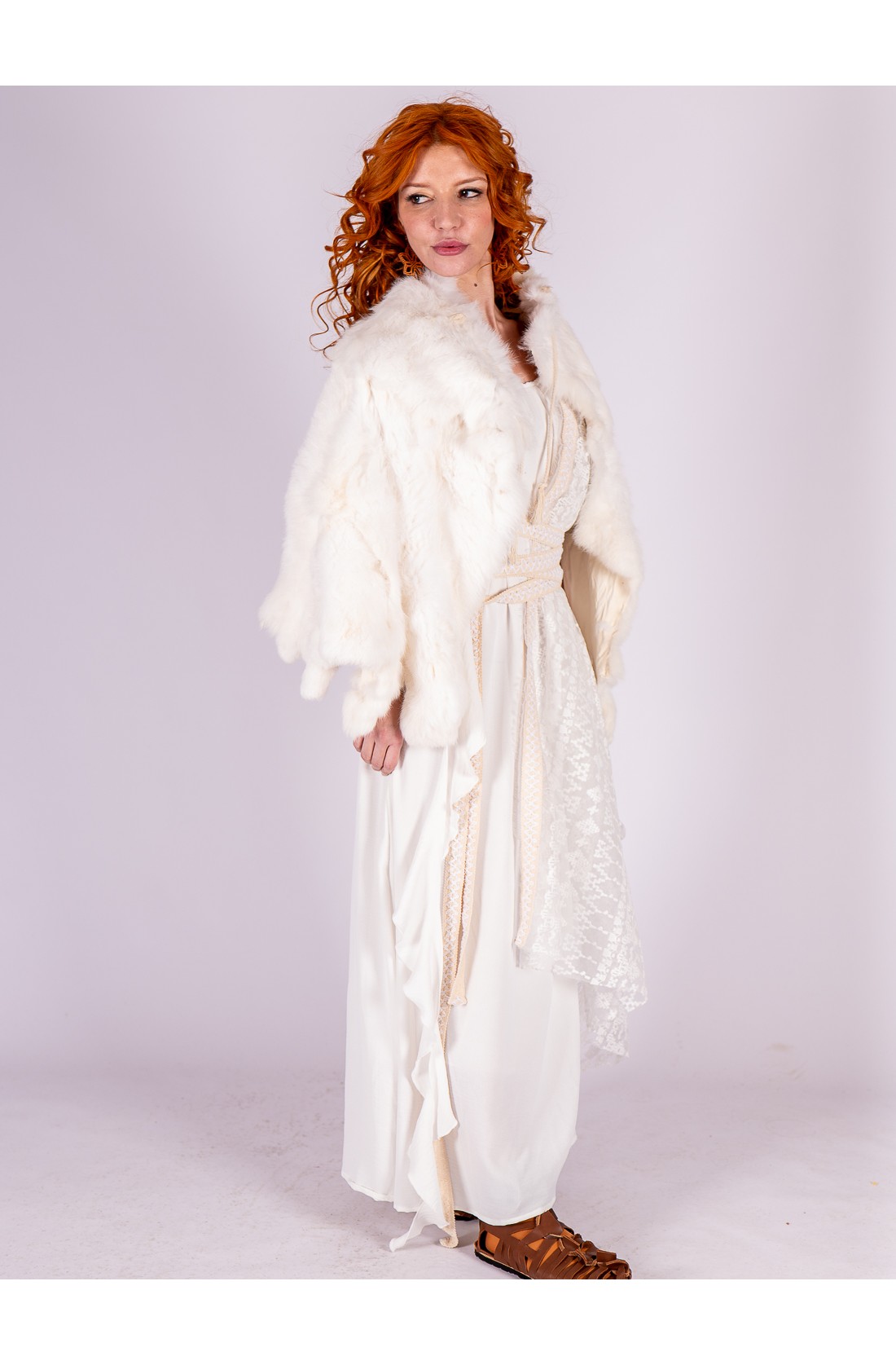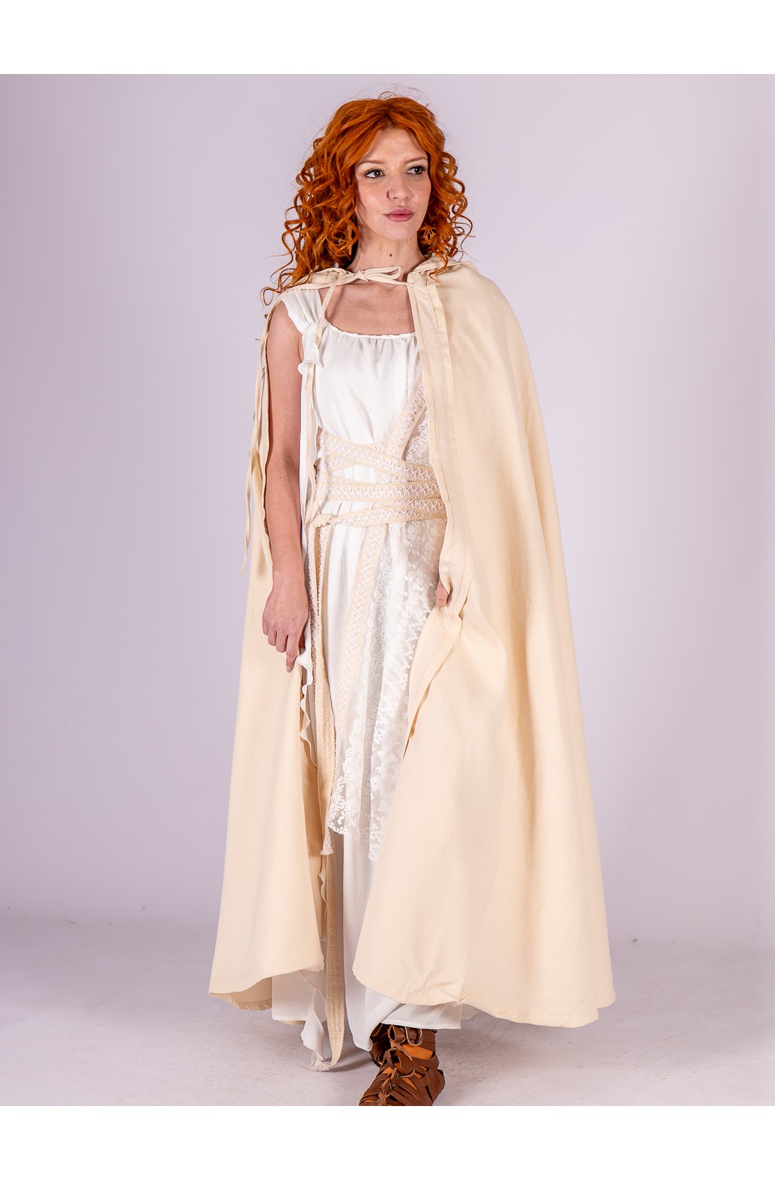 Lo acompaña un manto de encaje en tono blanco roto, con delicado motivo geométrico de inspiración clásica y acabado en crudo. Puede llevarse sobre un hombro o cubrir la cabeza a modo de velo, aportando un aire ceremonial y etéreo. La superposición de texturas crea profundidad y movimiento, evocando la estética de los mosaicos romanos y la elegancia serena de la antigüedad.