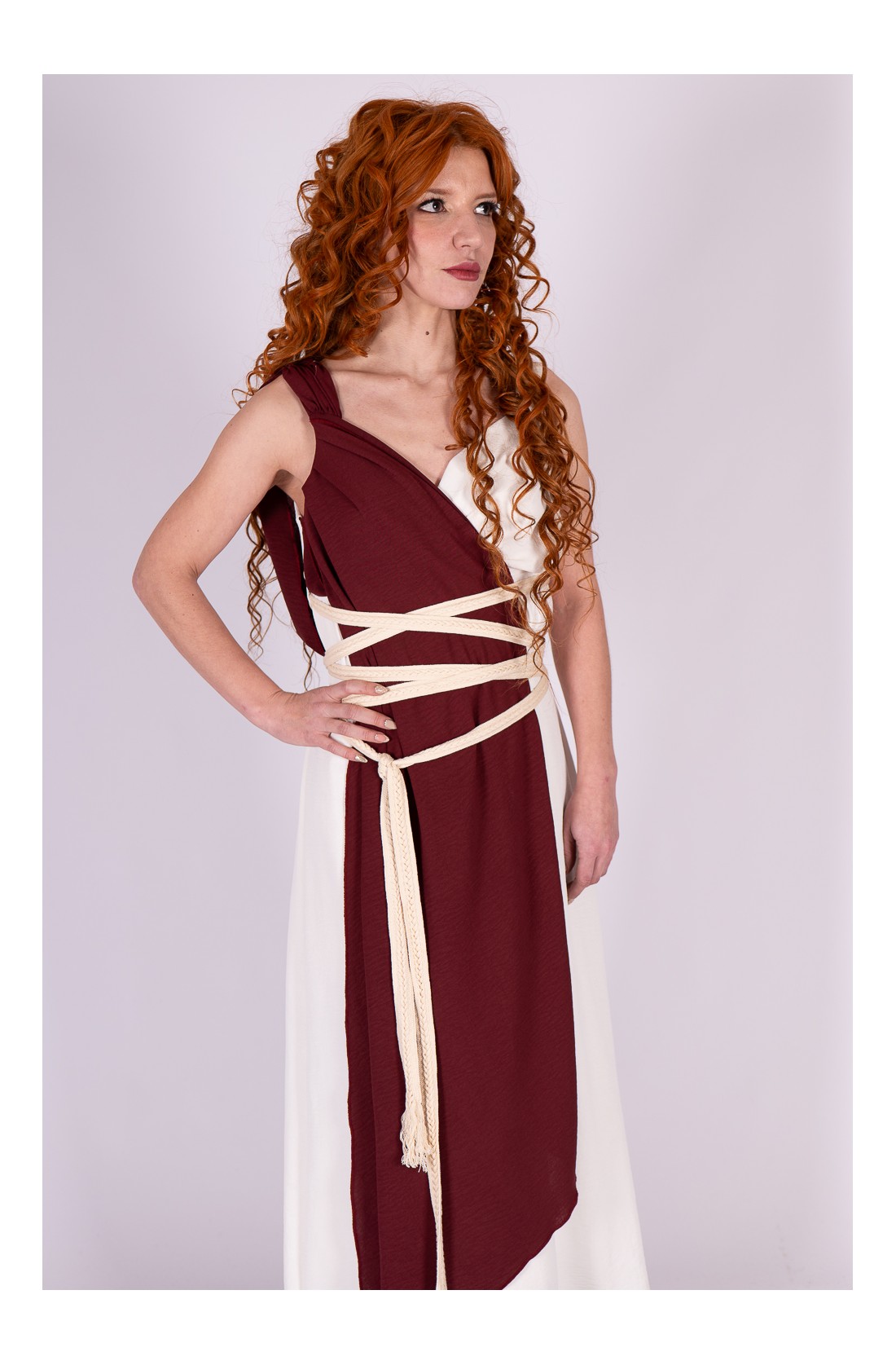 Vestido romano de inspiración clásica confeccionado en tono blanco, combinado con un panel asimétrico en burdeos que cruza el cuerpo y aporta profundidad y contraste. La superposición crea un efecto envolvente que estiliza la silueta y recuerda a los drapeados de la antigua Roma.