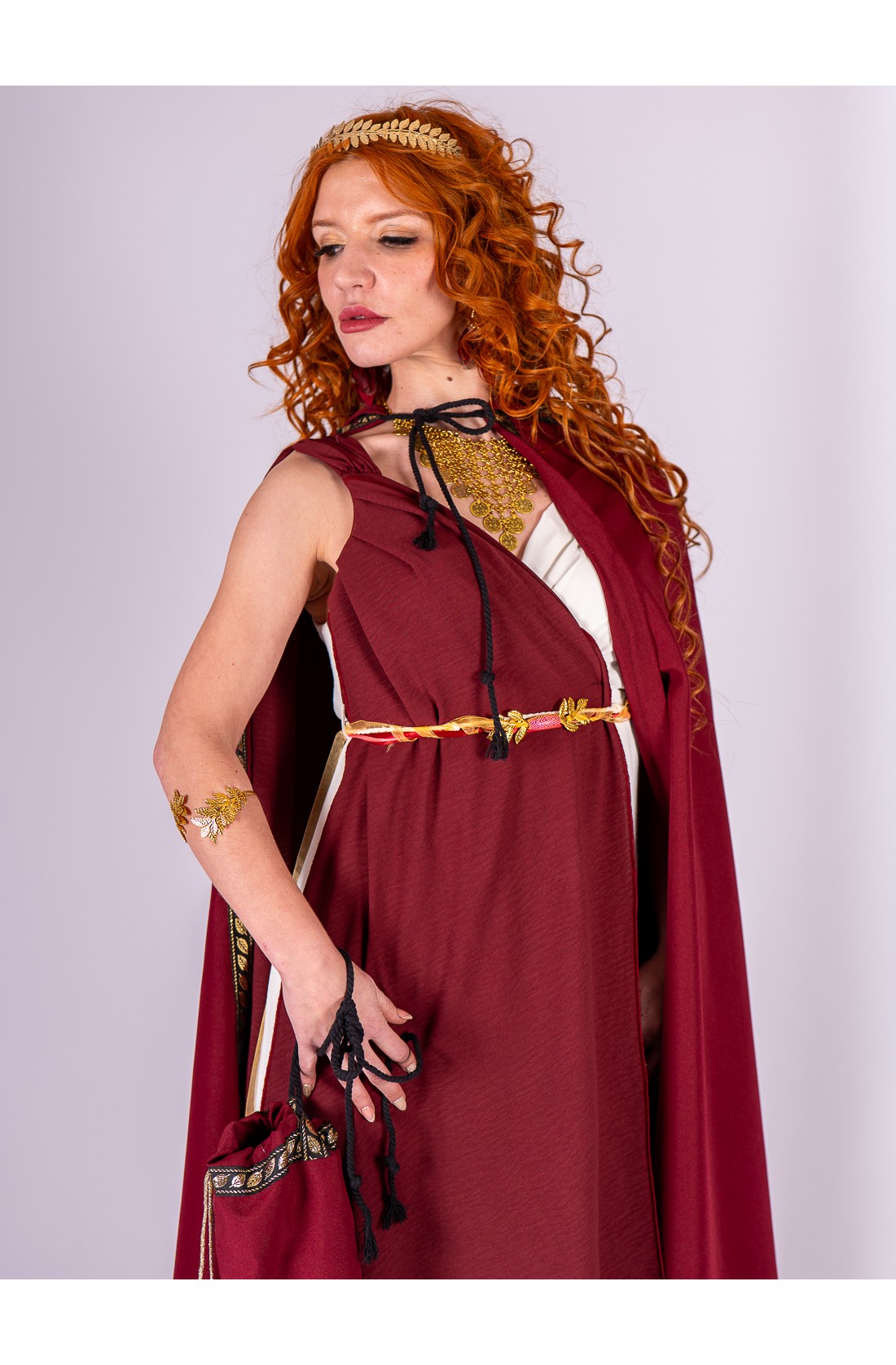 La capucha amplia está ribeteada con cinta decorativa de hojas doradas, un detalle que enmarca el rostro con luz y aporta un aire ceremonial sin resultar recargado. El contraste entre el granate y el dorado refuerza la estética clásica y realza cualquier vestido romano en tonos marfil, blanco o crema.
