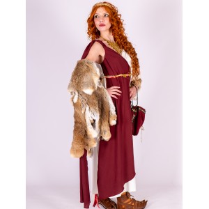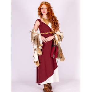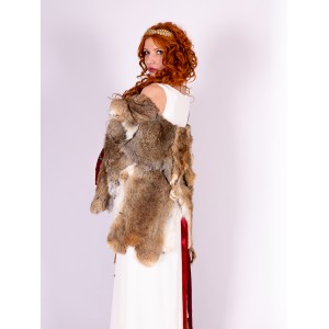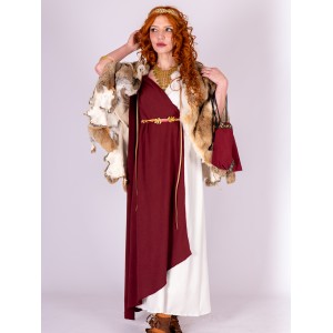 Colocada sobre los hombros, suma abrigo y presencia al conjunto de inspiración romana, evocando el estatus y la elegancia asociados a las mujeres nobles de la Antigüedad. Los contornos irregulares y el acabado natural refuerzan su carácter artesanal, haciendo que cada pieza tenga una personalidad propia.