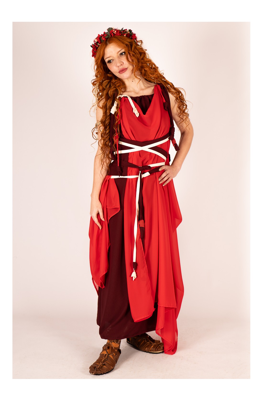 Vestido de inspiración romana en tonos burdeos y rojo intenso, con silueta fluida y caída ligera que acompaña el movimiento con naturalidad. El escote fruncido y los lazos en hombros aportan un aire delicado, mientras el cinturón cruzado en contraste estiliza la figura y permite ajustarlo a tu medida.